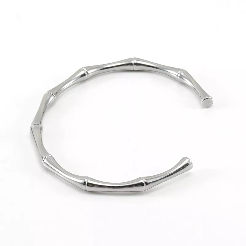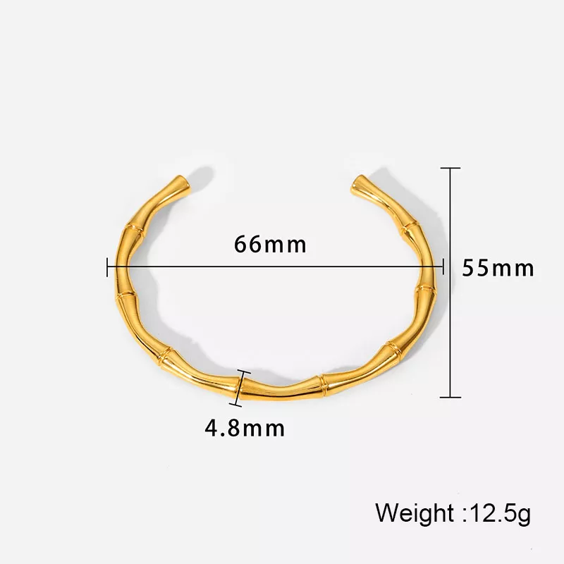 This cuff bracelet stands out with its minimalist yet bold design. The 18K gold plating ensures lasting shine, while the lightweight stainless steel construction offers durability without compromising on comfort. Its open cuff style makes it easy to wear and adjust, providing a secure fit for most wrist sizes. The bamboo-inspired texture adds a touch of nature-inspired elegance, making it a versatile accessory for any outfit.