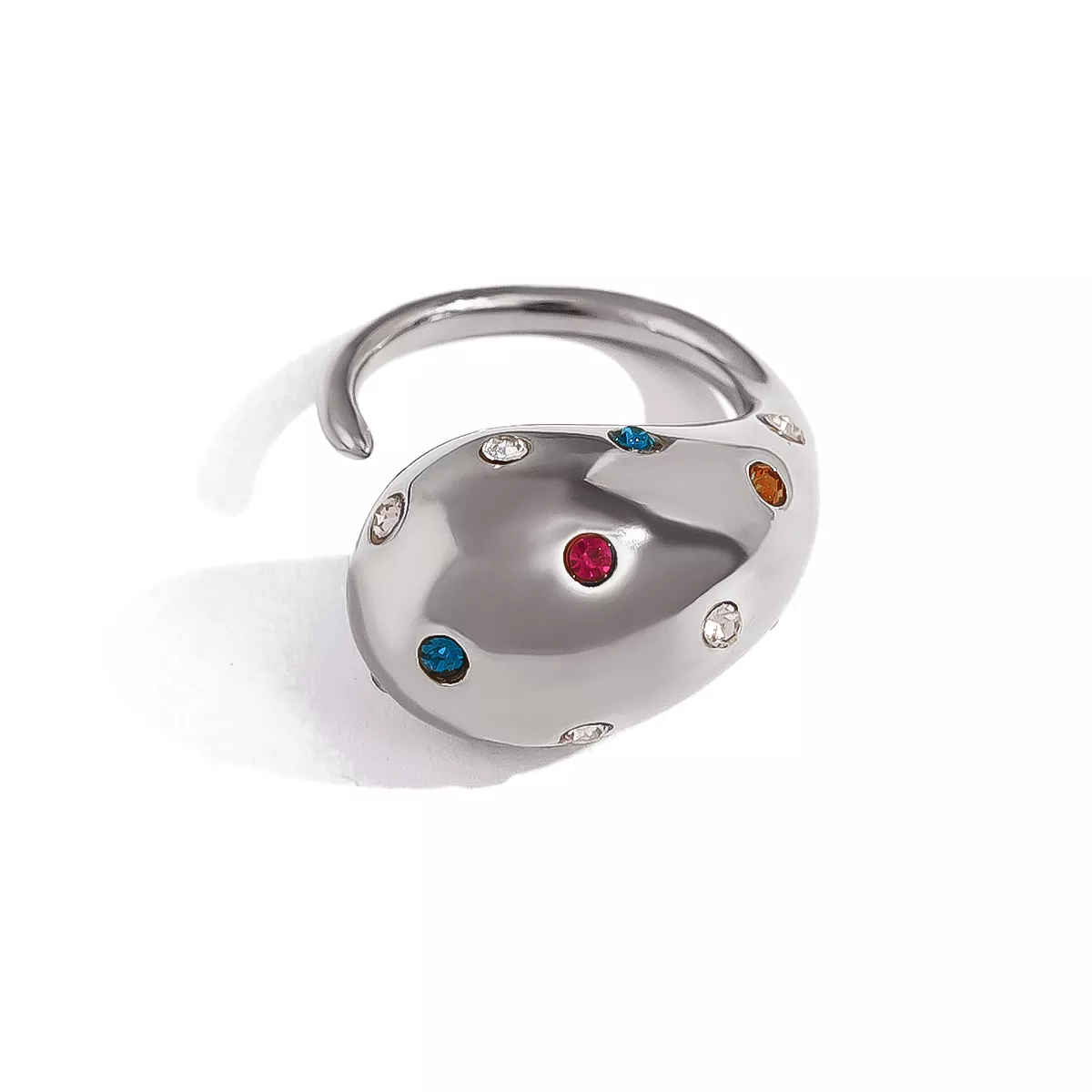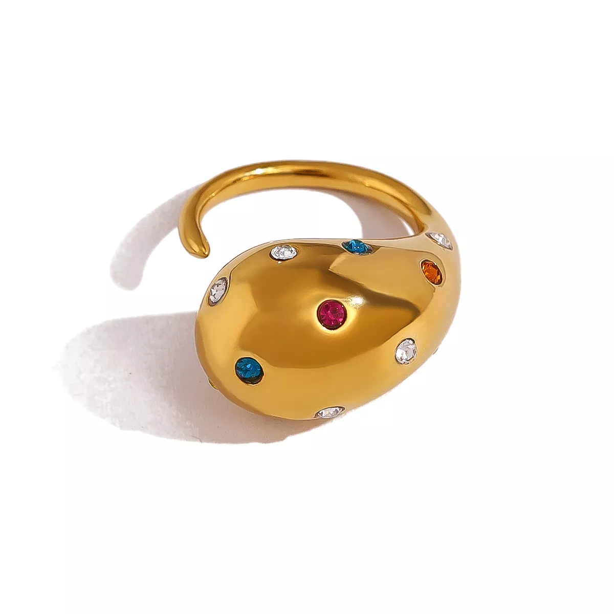 Unlike ordinary rings, this piece features an eye-catching combination of colorful crystals and a chunky design, making it truly one-of-a-kind. The 18K gold plating ensures it maintains its luxurious shine, while the stainless steel base guarantees durability. It’s not just a piece of jewelry—it’s a statement of confidence and individuality.