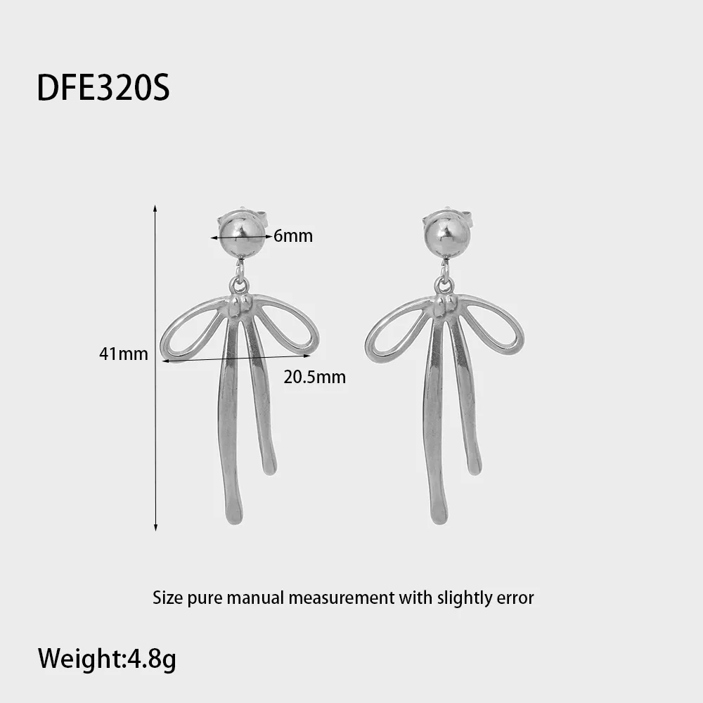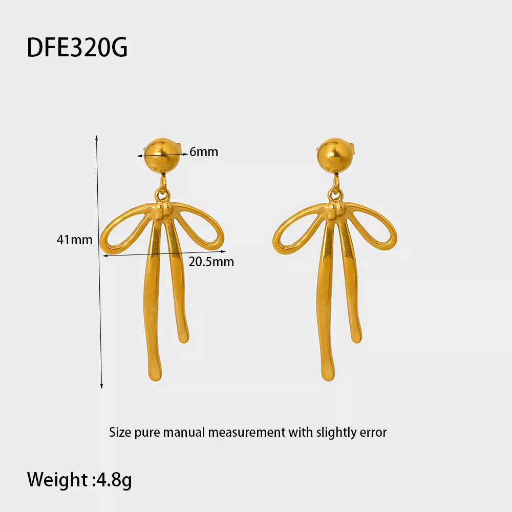 Elevate your style with these 18K Gold Plated Stainless Steel Ribbon Bowknot Drop Earrings. Designed with a graceful bowknot shape, these earrings bring a touch of charm and sophistication to any outfit. Lightweight and versatile, they are perfect for women who appreciate subtle yet impactful accessories. Whether as a gift or a personal indulgence, these trendy dangle studs are a must-have addition to your jewelry collection.