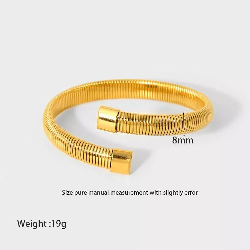 This bracelet combines beauty and functionality, making it the perfect accessory for any occasion. Its sleek and modern design features a delicate open texture that adds sophistication to your look without being overpowering. The PVD 18K gold plating not only ensures a luxurious finish but also makes it resistant to tarnishing, so it retains its radiant shine even with frequent wear. Lightweight and comfortable, this bangle is perfect for women who want a piece of jewelry that works seamlessly with both casual and formal outfits.
