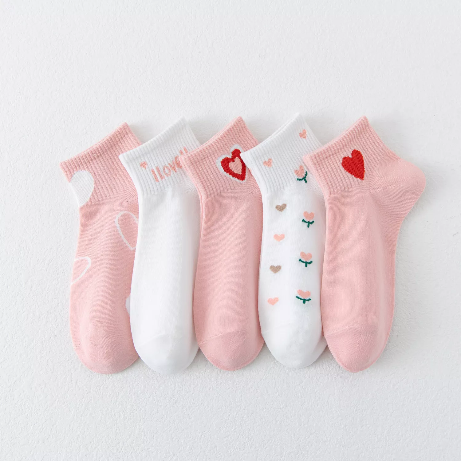 Step into comfort and style with this set of 5 pairs of Women’s Japanese Pink Love Short Socks. Designed with breathable hollow-knit fabric, these low-cut socks are perfect for any occasion. Whether you’re dressing up for work, heading out with friends, or enjoying a cozy day at home, these socks will keep your feet feeling fresh and looking chic.