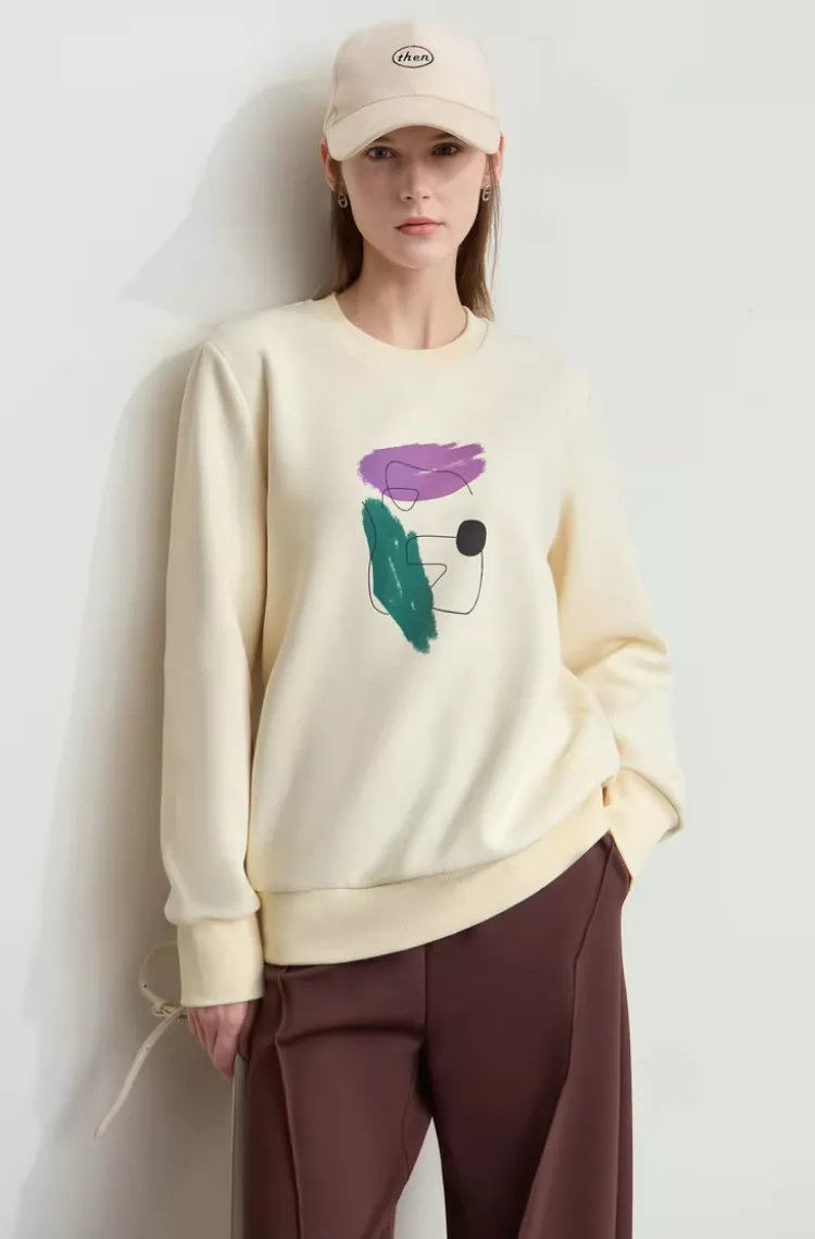 What sets this sweatshirt apart is its perfect balance of comfort and style. The thick fleece lining keeps you warm while the abstract print elevates your casual look with an artistic twist. Its slightly stretchy fabric offers a comfortable fit that adapts to your movements, ensuring you feel unrestricted throughout the day. The loose silhouette is flattering and versatile, making it a go-to piece for layering during chilly mornings or cozy evenings.