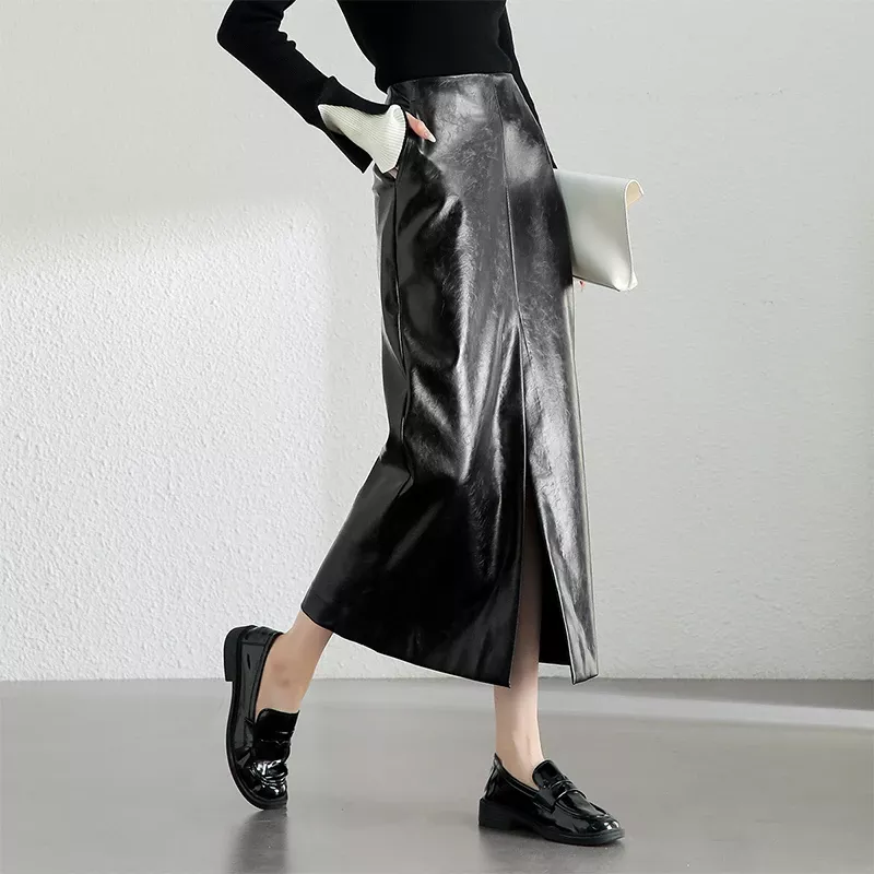The high-waisted design enhances your natural waistline, giving you a slimmer, elongated look, while the slit hem adds a modern twist to a timeless classic. This skirt is perfect for those who appreciate high-fashion details in their everyday wardrobe. Whether you’re a professional on the go or a trendsetter looking for your next wardrobe staple, this faux leather midi skirt is your perfect fit.