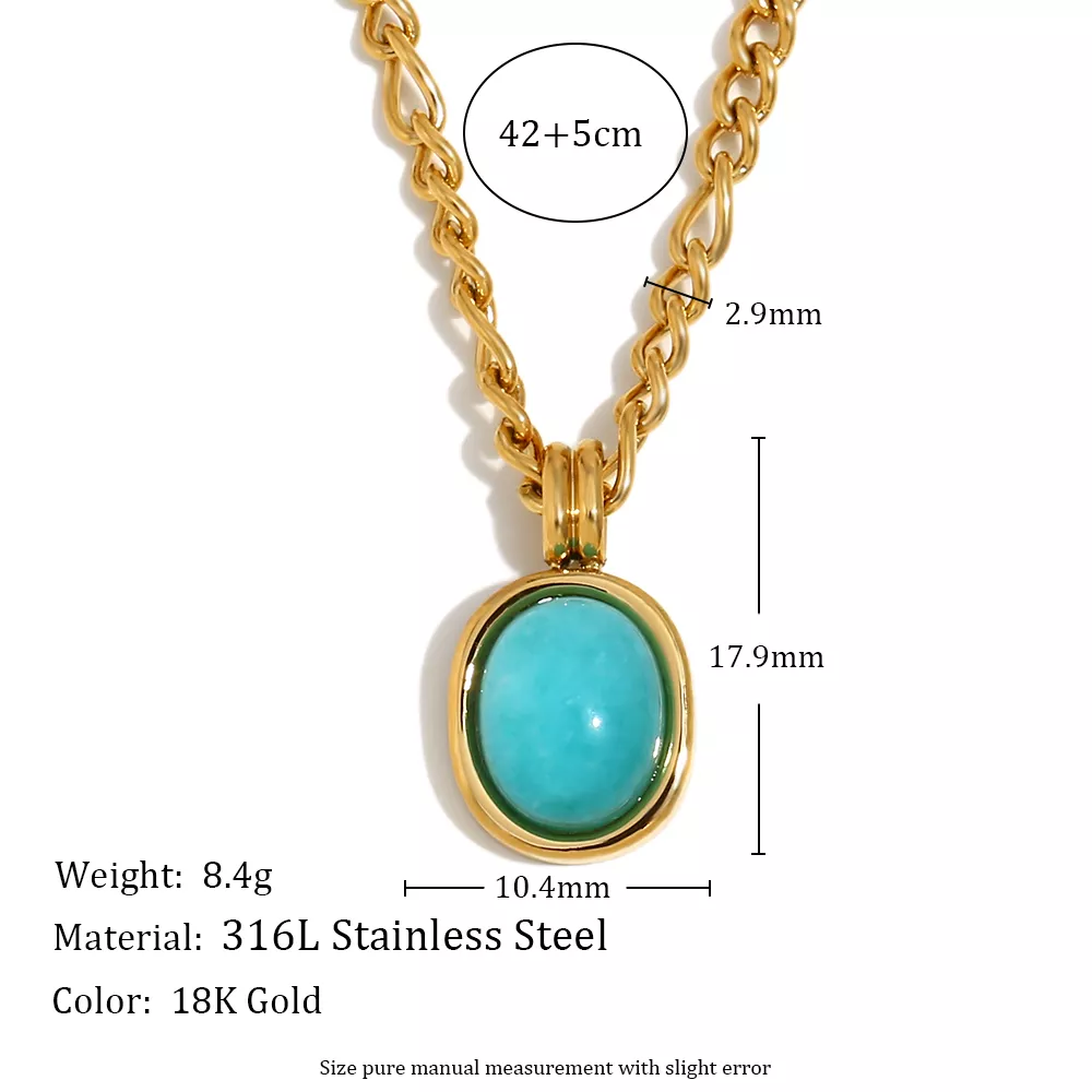This necklace stands out for its harmonious blend of natural beauty and vintage-inspired design. The Amazonite stone exudes a calming blue tone that’s both captivating and versatile, while the 18K gold-plated stainless steel chain ensures lasting brilliance. Whether worn as a personal statement piece or given as a thoughtful gift, this necklace combines simplicity, elegance, and meaning.