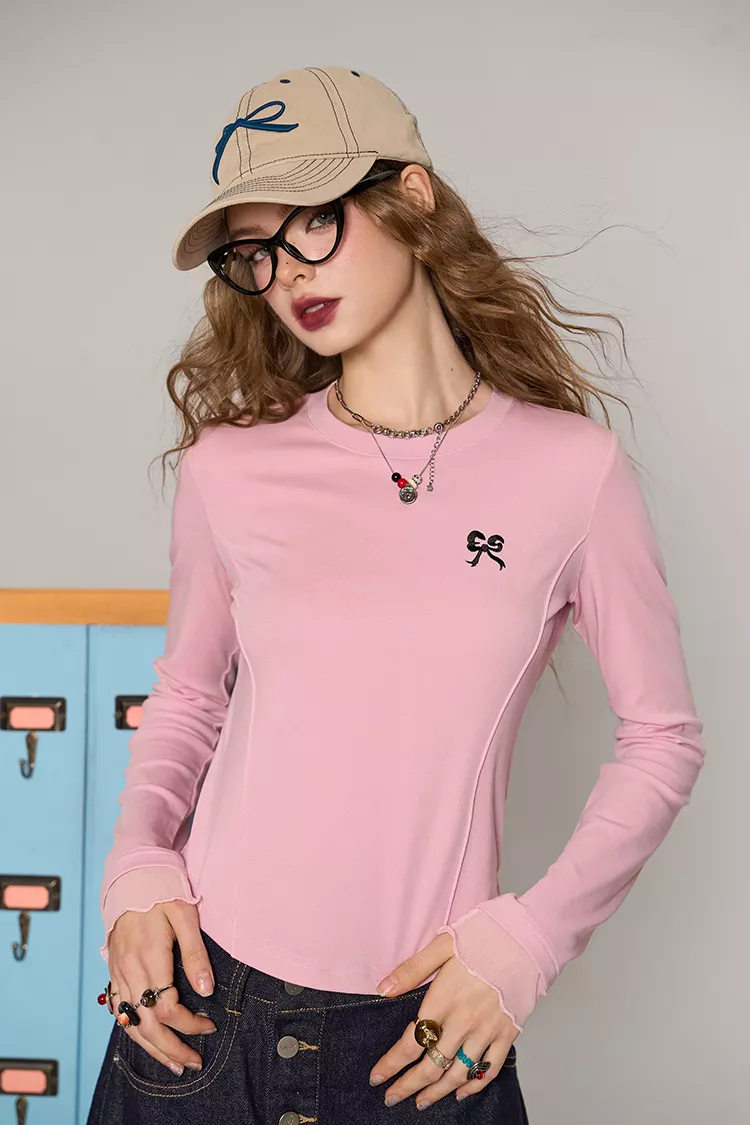 Bowknot Embroidery Solid Color Slim Fit Long Sleeve T-Shirt for Women