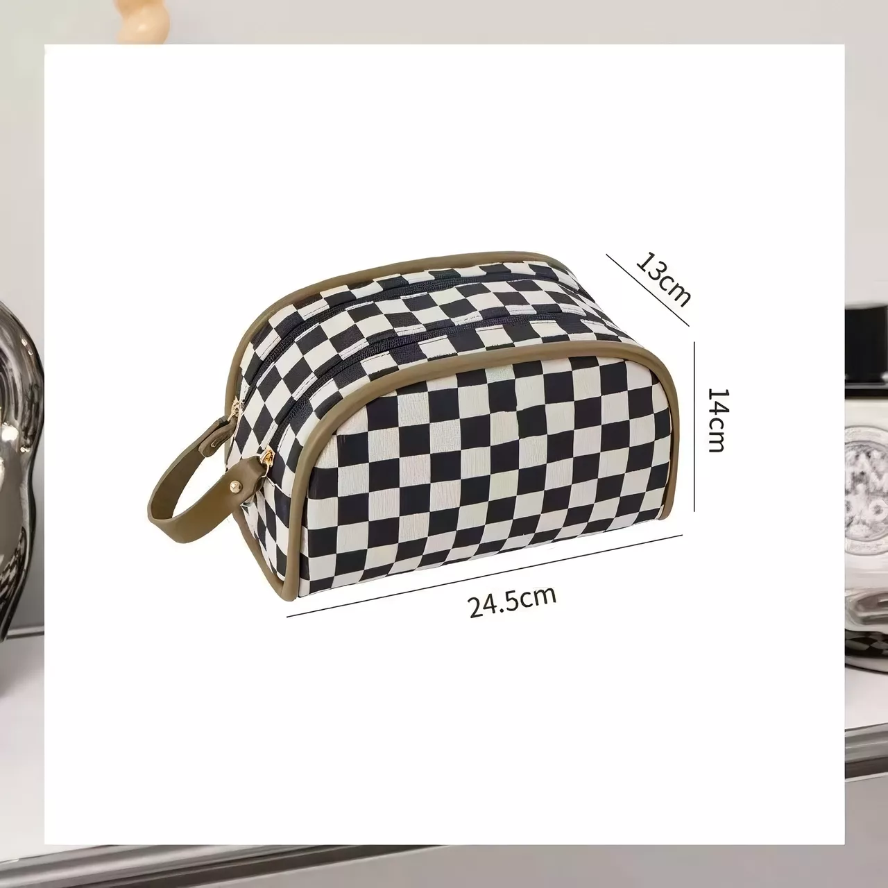 This cosmetic bag isn’t just about utility—it’s about making a statement. The soft yet durable construction makes it easy to pack and carry, while the stylish checkerboard design adds a touch of vintage charm to your travel essentials. Its versatility means it works equally well as a travel pouch, everyday organizer, or even a clutch for casual outings. Plus, the waterproof material ensures that your items stay safe, no matter where you take it.