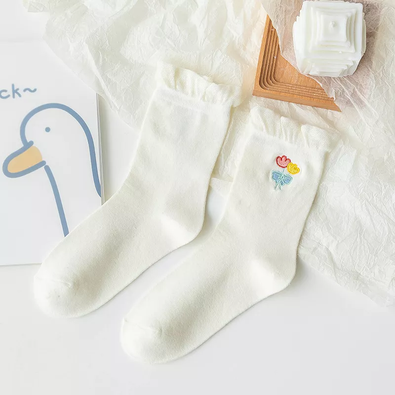 The embroidered cartoon designs and ruffle trim make these socks truly one-of-a-kind. Whether you’re a fan of kawaii fashion or just want to add a unique flair to your outfit, these socks are the perfect choice. With their high-quality cotton construction, they combine durability and softness, ensuring they remain a staple in your wardrobe for years to come.