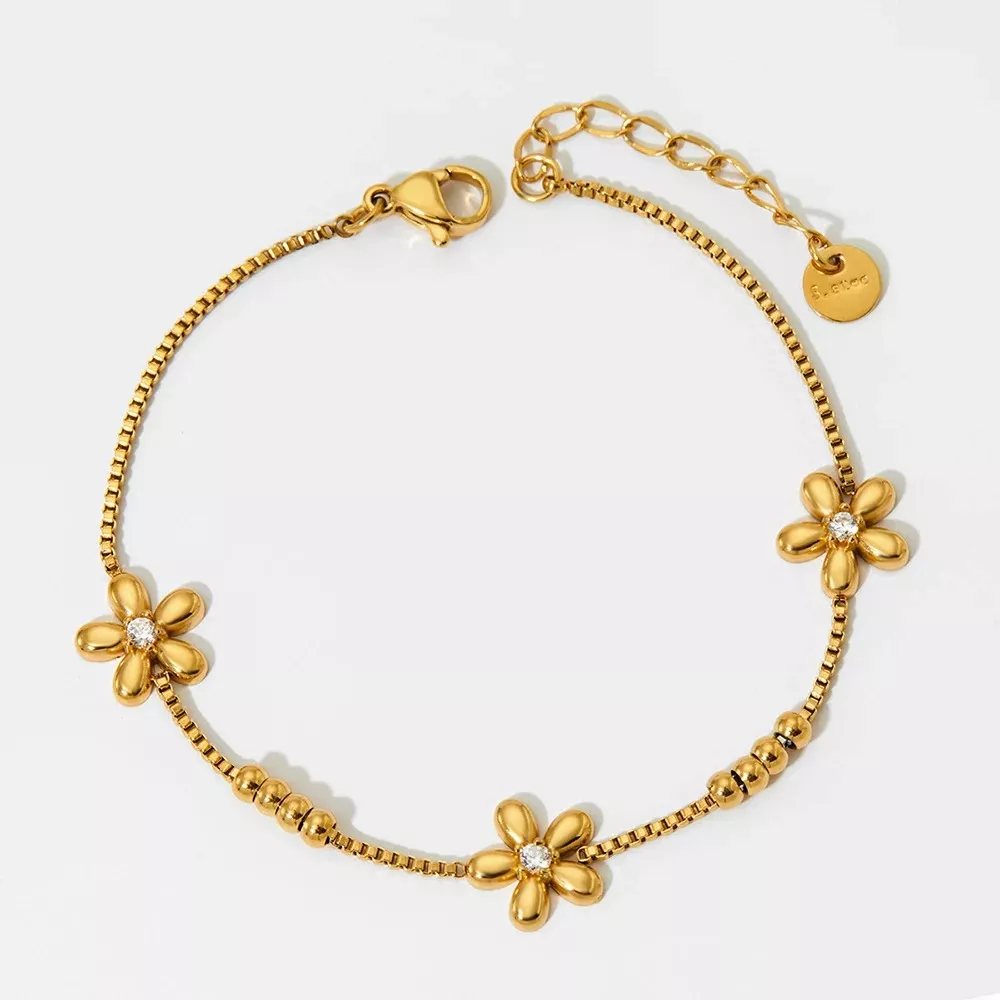 Enhance your jewelry collection with this exquisite Dainty 16K Gold Plated Stainless Steel Beads and Cubic Zirconia Bracelet. Designed for the modern woman, this bracelet effortlessly combines style and sophistication. Made from high-quality stainless steel and plated with 16K gold using PVD technology, it exudes a luxurious shine that lasts. The addition of shimmering cubic zirconia stones and delicate flower-shaped accents adds a touch of feminine charm to any outfit.