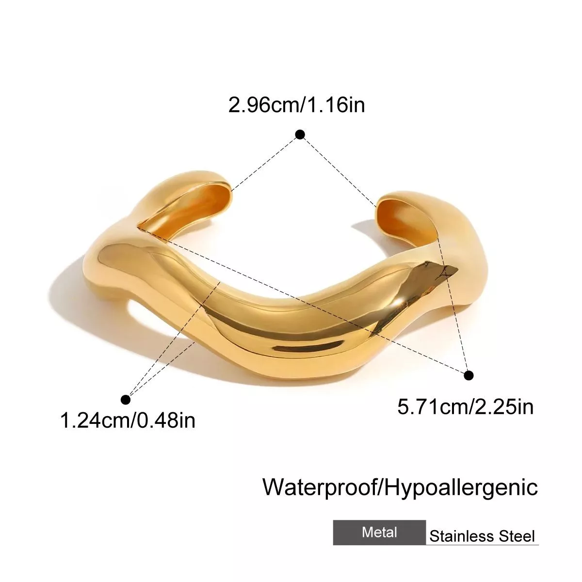 This bracelet is meticulously crafted from high-quality stainless steel with an 18K PVD gold plating, ensuring a long-lasting and radiant finish. Its geometric wave pattern exudes a contemporary vibe, making it a standout piece in your jewelry collection. Designed to resist fading and scratches, it retains its beauty for years to come. Waterproof and free from nickel, lead, or cadmium, it’s safe for even the most sensitive skin.