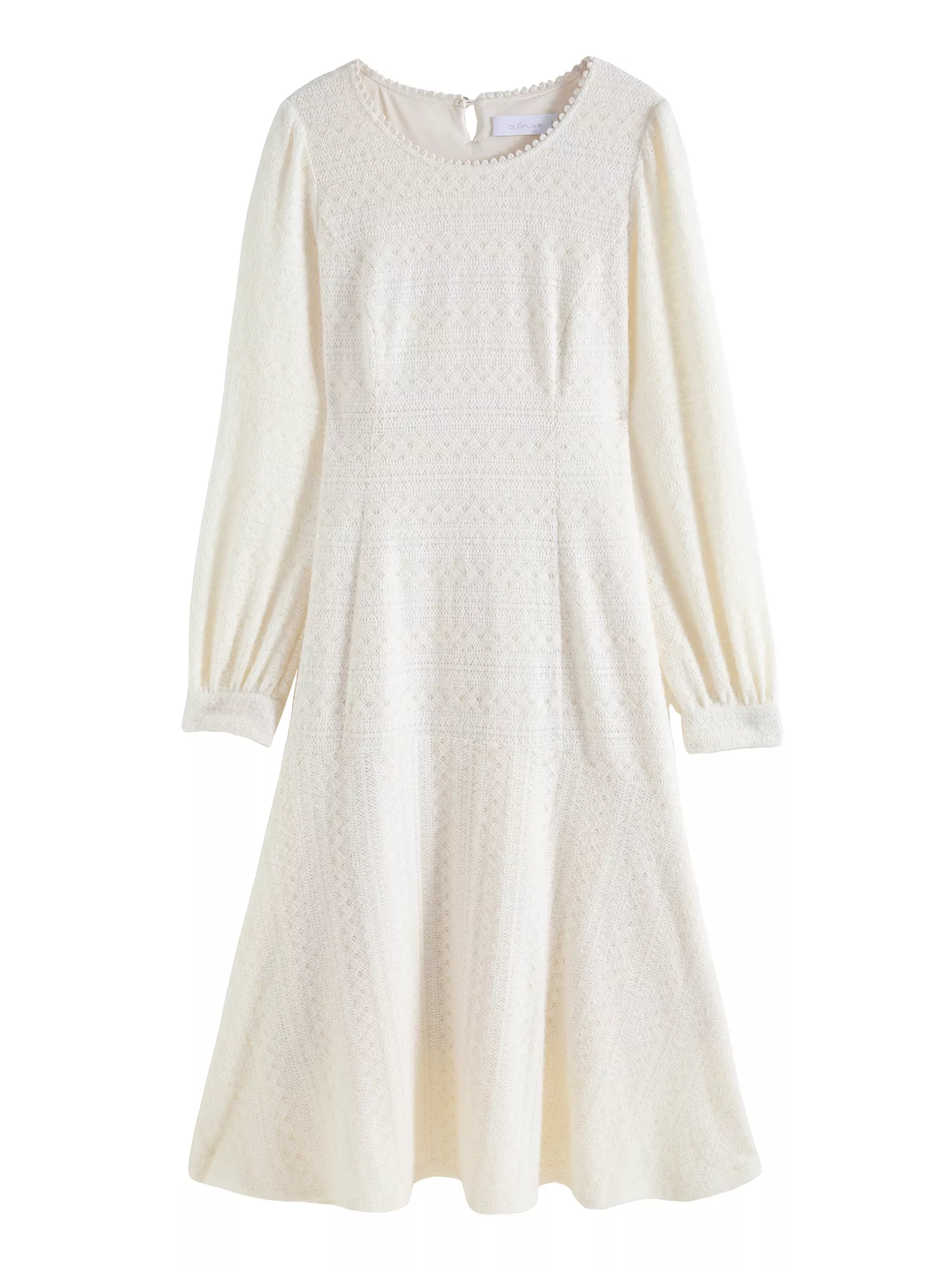 Embrace the elegance of winter fashion with this stunning beige lace dress. Designed to exude sophistication and femininity, this long-sleeve dress features a fit-and-flare silhouette that flatters all body types. Perfect for office settings, elegant dinners, or winter celebrations, this dress combines style, comfort, and versatility. Its timeless appeal makes it a must-have for any wardrobe.