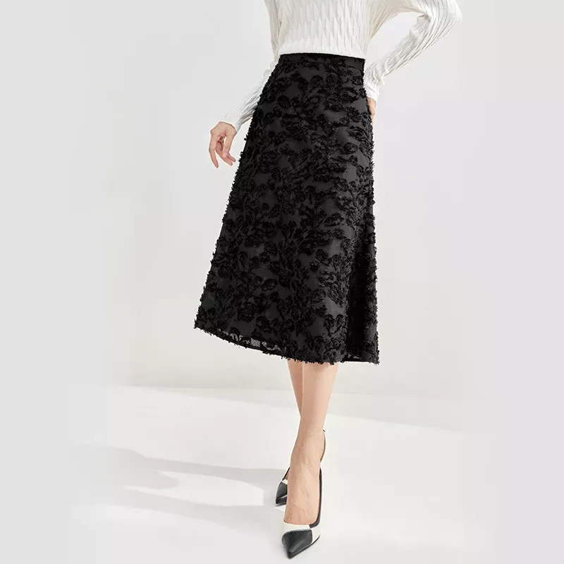 Transform your outfit with the Elegant Black A-Line Midi Skirt for Women, designed to make a statement wherever you go. This sophisticated skirt features a flattering A-line silhouette, adorned with exquisite three-dimensional floral decorations. Its elastic waist ensures a perfect fit while providing all-day comfort, making it ideal for both professional and casual settings. Crafted with a jacquard fabric that exudes elegance, this skirt is the perfect addition to your wardrobe.