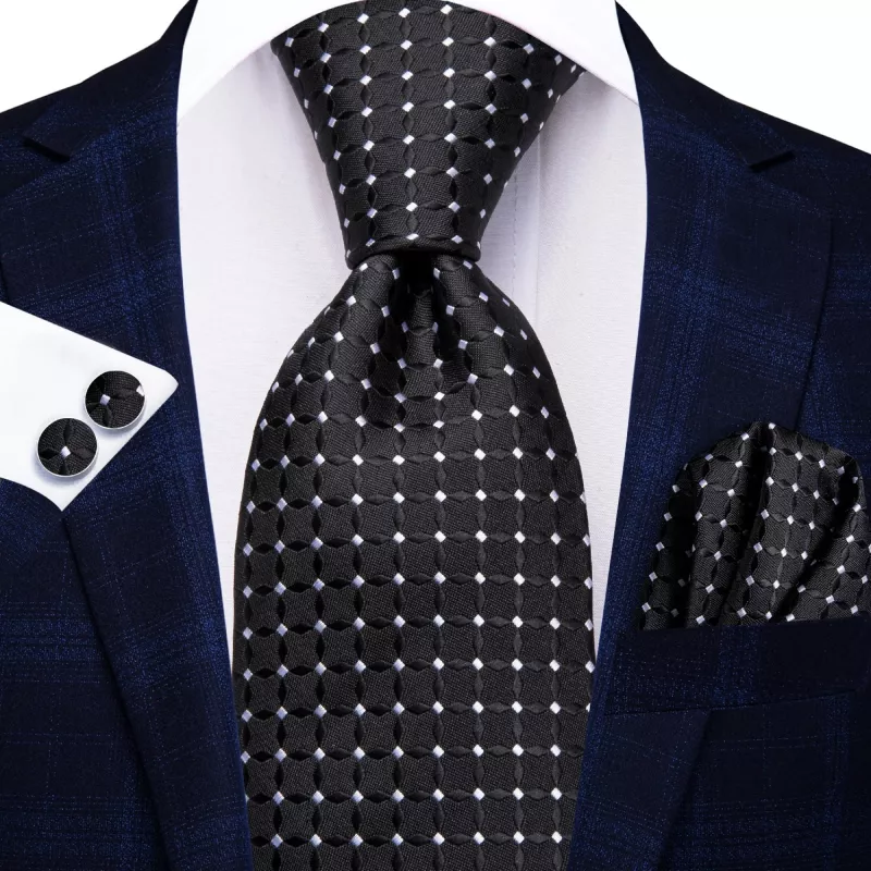 Make a bold statement at your next business meeting, wedding, or special event with this elegant black and white polka dot silk necktie set. Crafted from 100% jacquard woven silk, this tie combines timeless design with modern sophistication. The perfect accessory to complete your polished look, this set includes a high-quality necktie, tie clip, cufflinks, and a matching pocket square, making it an ideal choice for men who appreciate style, attention to detail, and luxury. Whether you’re dressing for a formal affair or adding a stylish touch to your everyday attire, this tie set offers versatility and class.