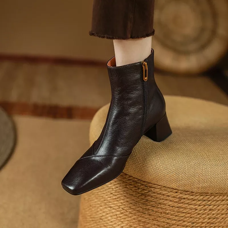 Elevate your winter wardrobe with these elegant cow leather ankle boots. Designed for office professionals and fashion-forward women, these boots combine retro charm with modern sophistication. The square toe and high square heel create a polished, chic silhouette, while the genuine leather construction ensures durability and lasting style. Perfect for workdays and casual outings, these versatile boots are your go-to choice for a refined, elegant look.