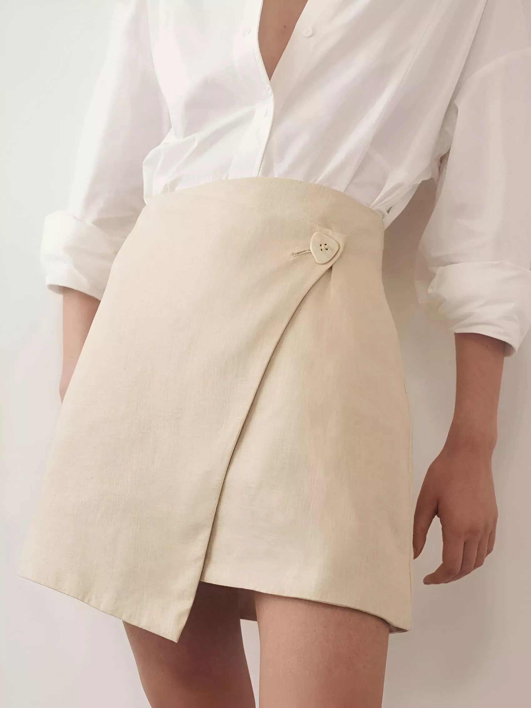 For a classic office look, pair this beige linen skirt with a crisp white blouse and low heels. For a more relaxed outfit, tuck in a casual t-shirt and throw on some sneakers. The minimalist design also allows you to accessorize with bold jewelry or a statement belt for added flair.