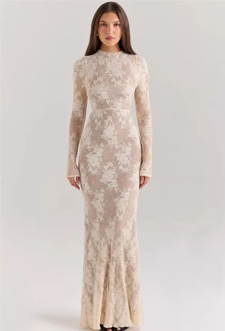 Turn heads wherever you go with this stunning lace print long sleeve maxi dress. Designed to enhance your natural silhouette, this bodycon dress exudes sophistication and elegance, making it a perfect choice for both formal occasions and special nights out. The soft white fabric combined with delicate lace detailing and a half-high collar creates a timeless and chic look that radiates confidence and style.