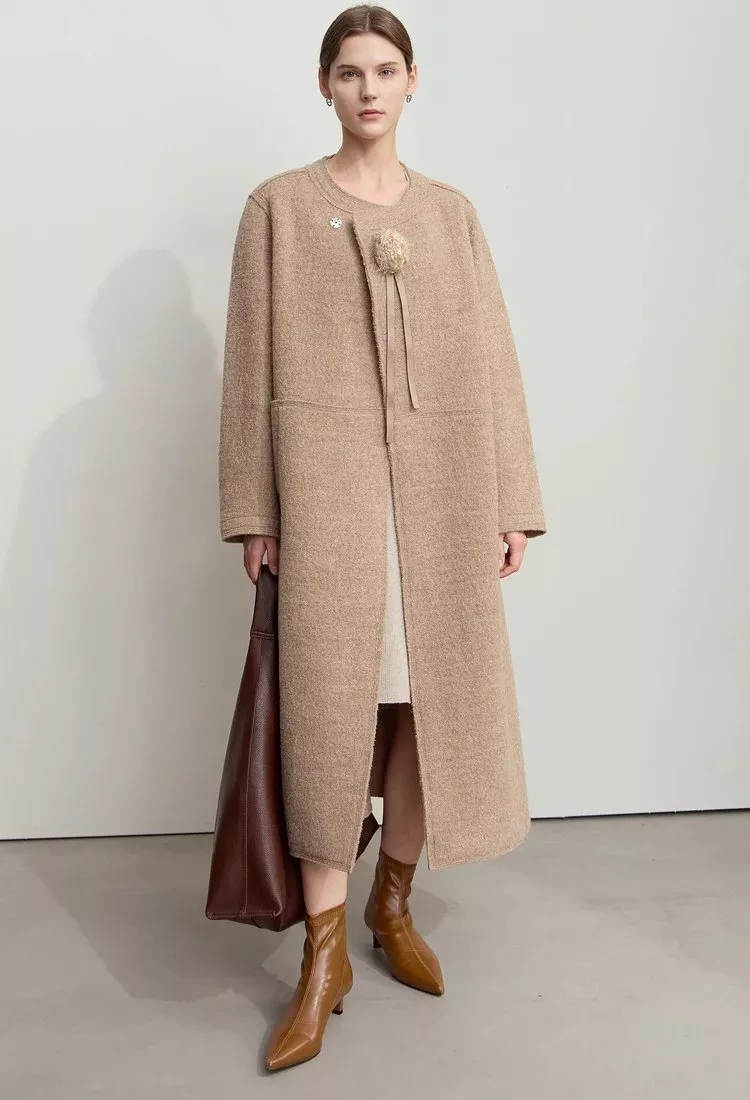 Step into winter in style with this exquisite 100% wool coat. Designed with sophistication and practicality in mind, this long outerwear piece exudes timeless elegance while keeping you warm and comfortable during chilly days. The clean, minimalist design features a round neck and a removable corsage for versatile styling, making it an ideal choice for office wear, casual outings, or formal occasions.