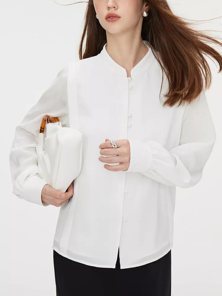 This pure white blouse combines effortless style with practical design. The fake two-piece construction allows you to enjoy the layered look without the fuss, creating a sleek and polished appearance. Its half-high collar and full-length sleeves give you just the right amount of coverage and warmth, while the regular fit ensures all-day comfort. The simple yet elegant design makes this shirt perfect for both casual and more formal occasions.