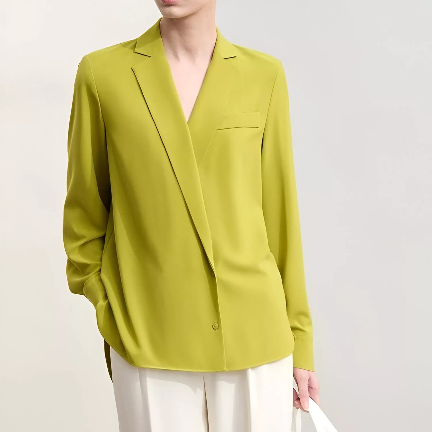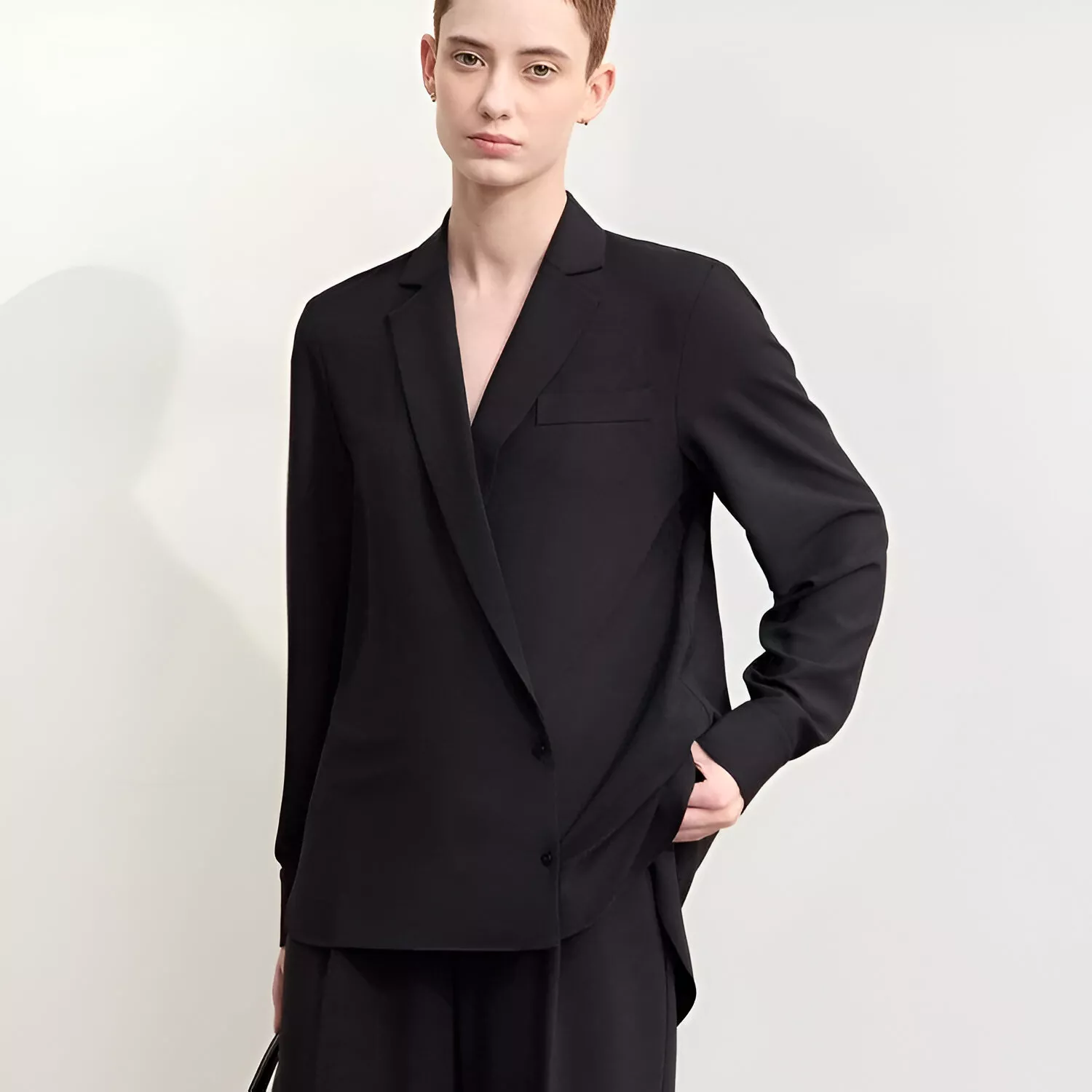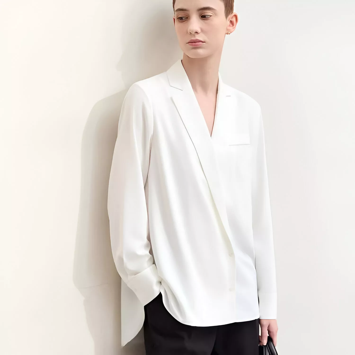 Step into sophistication with our Elegant Winter Long-Sleeve Blazer Collar Loose Chiffon Shirt. This chic blouse is designed to make a statement while ensuring comfort and versatility. Perfect for the modern woman, it seamlessly transitions from the office to casual outings, exuding confidence and grace. The notched blazer collar adds a refined touch, while the loose fit offers a relaxed yet polished look.
