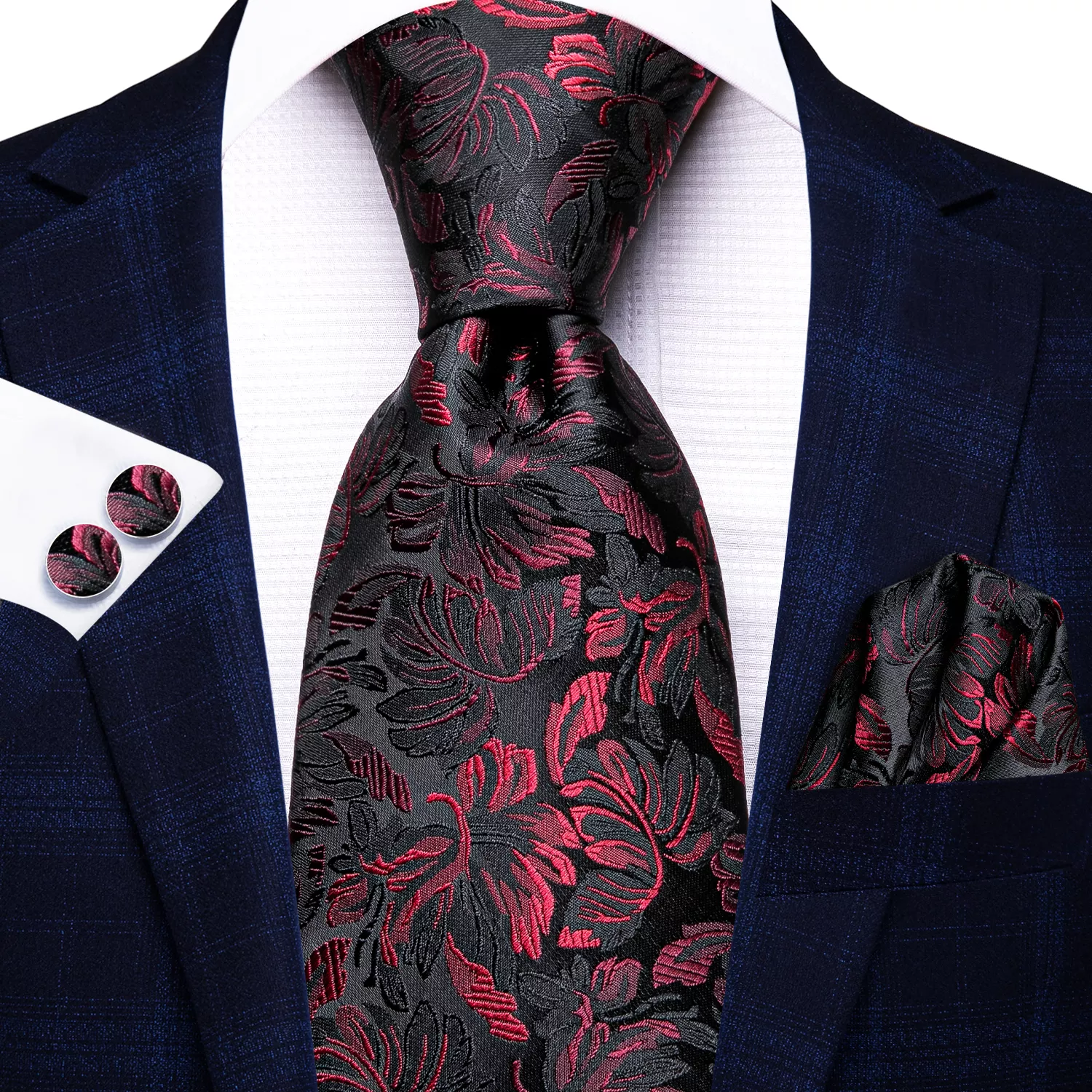 Step up your formalwear game with this luxurious Floral Black Red Silk Tie Set. Designed with sophistication in mind, this set is perfect for weddings, parties, or professional events. The elegant floral pattern in black and red adds a unique touch of refinement, making you stand out with confidence. This set includes a hand-woven silk necktie, matching pocket square, cufflinks, tie clip, and comes beautifully packaged in a premium gift box. Whether it’s a special occasion or a thoughtful gift, this tie set is a must-have for the modern gentleman.