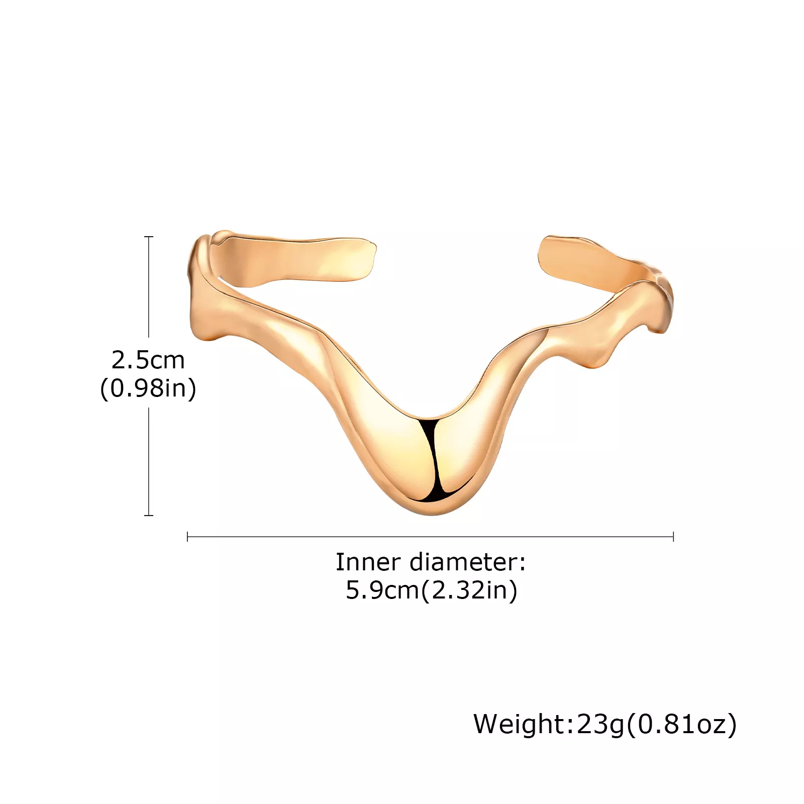 Crafted from durable lead-tin alloy with a beautiful gold-plated finish, this cuff bracelet is designed to last. The 3-layer vacuum plating ensures that the gold color remains vibrant without fading over time. Additionally, the metal is hypoallergenic, making it perfect for those with sensitive skin. The open cuff design is both adjustable and comfortable, fitting most wrist sizes with ease. The irregular wave pattern adds an artistic and dynamic touch, making this piece a standout accessory in your collection.