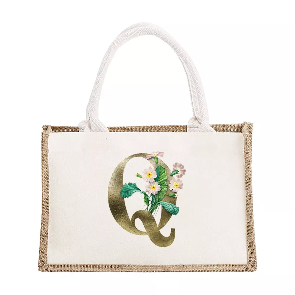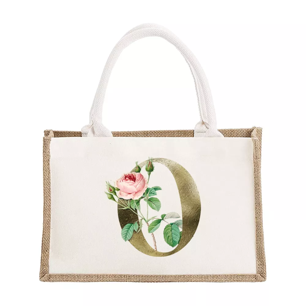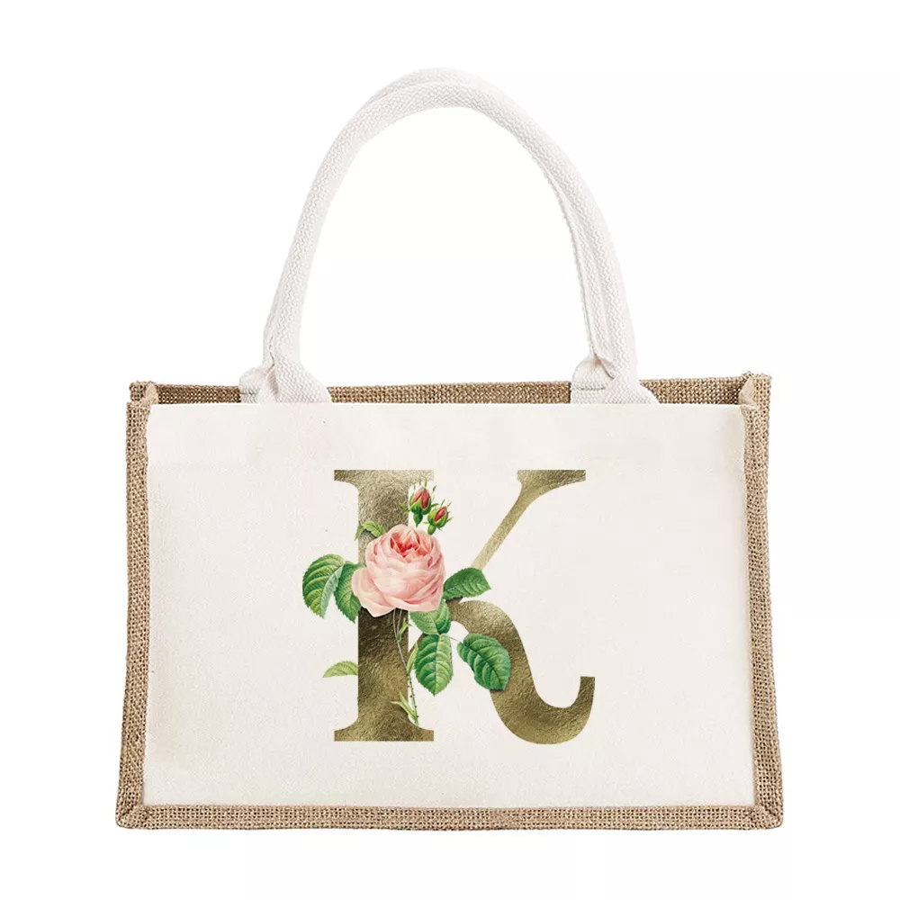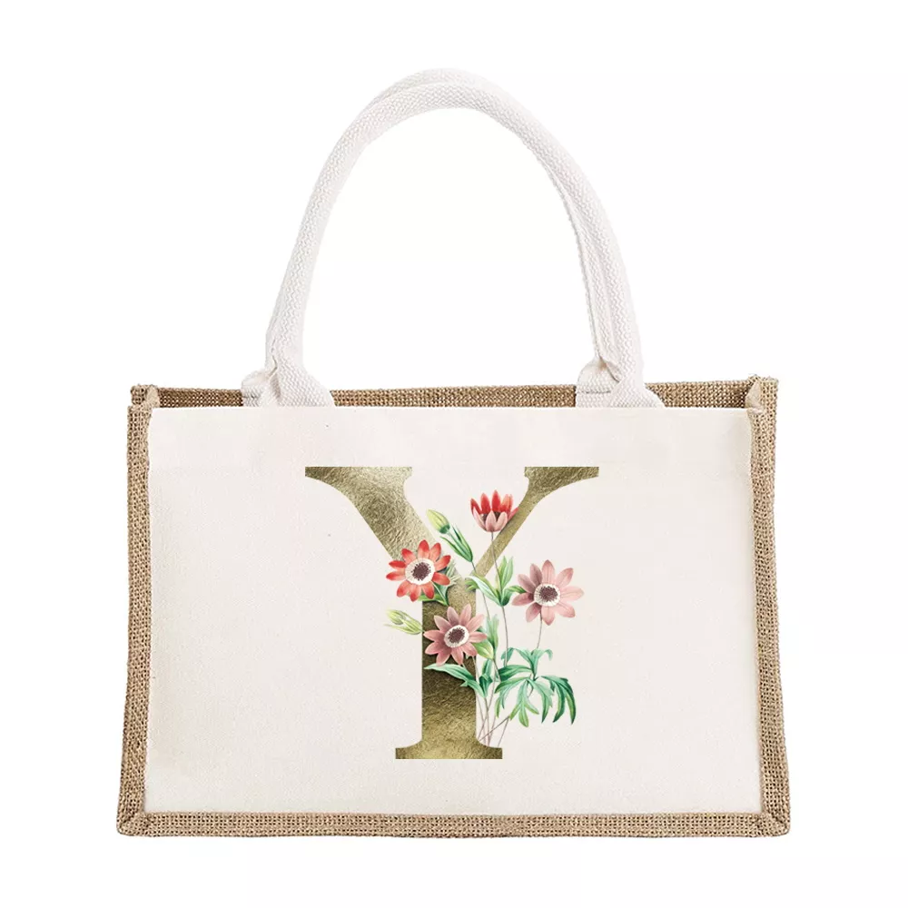 Elevate your everyday with this beautifully designed Golden Letter Print Jute Canvas Tote Bag. Crafted from eco-friendly burlap material, this sturdy yet elegant tote combines functionality with charm. Its versatile design makes it perfect for everything from shopping trips to bridal party gifts. With a generous size of 14.6 x 10.2 x 5.7 inches, it offers ample space for all your essentials, whether you’re traveling, heading to the market, or organizing your sundries.