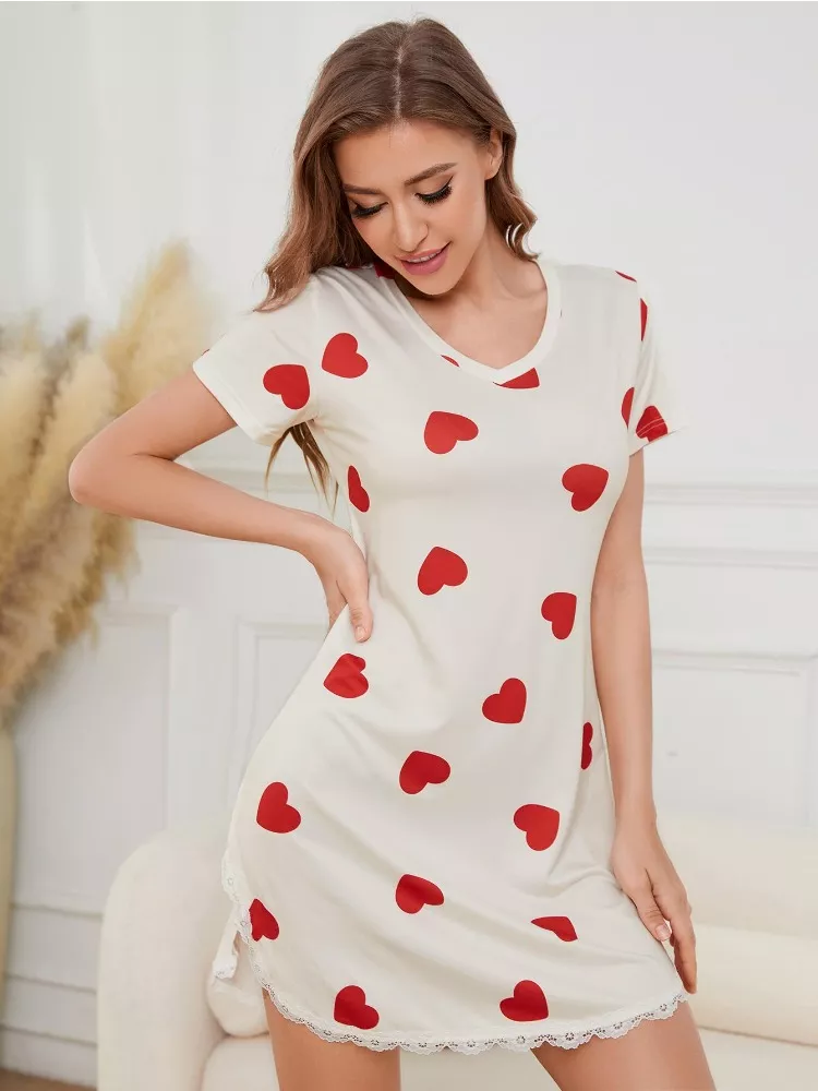 Heart Print Lace Hem V-Neck Summer Nightgown with Side Slit and Short Sleeves