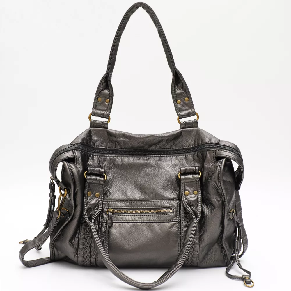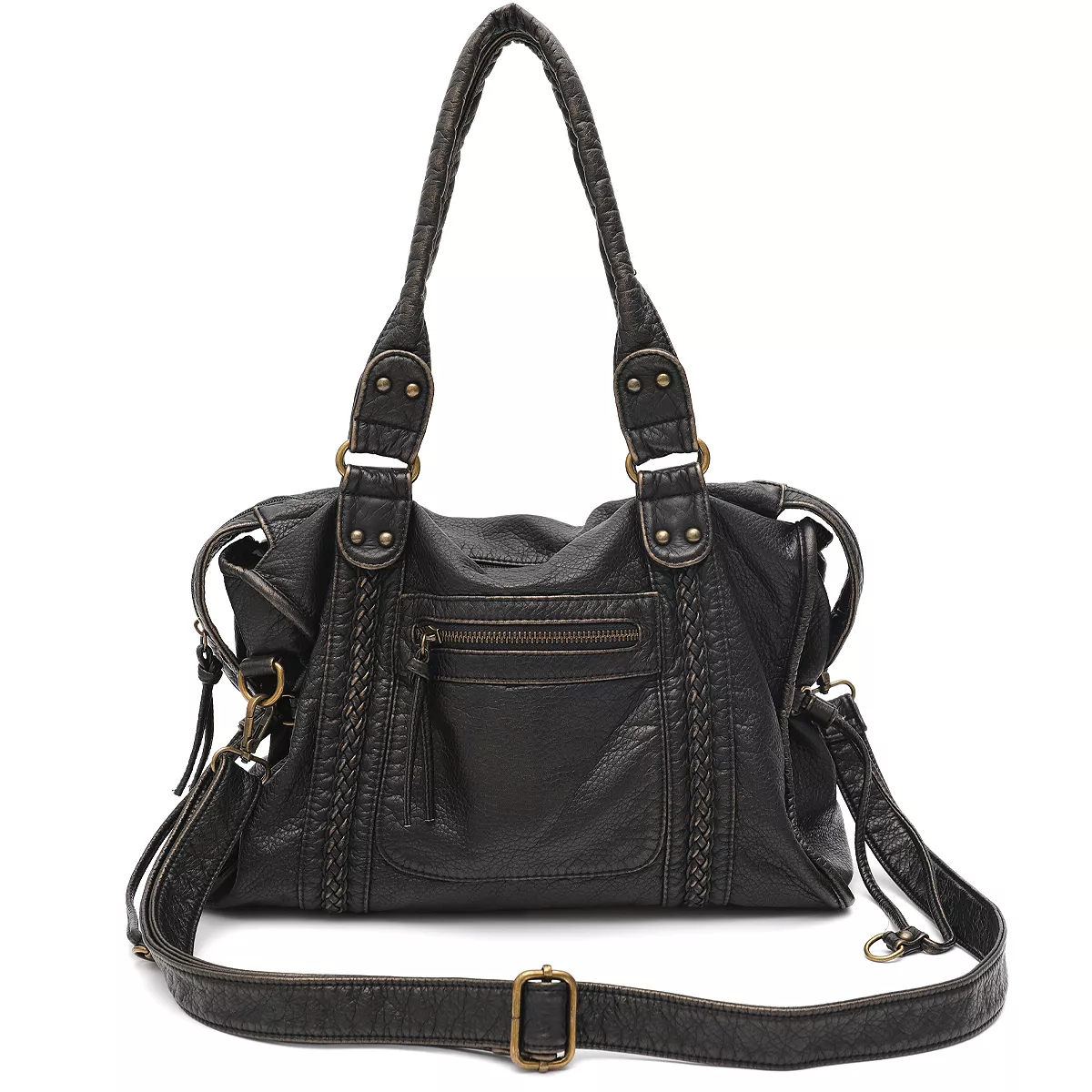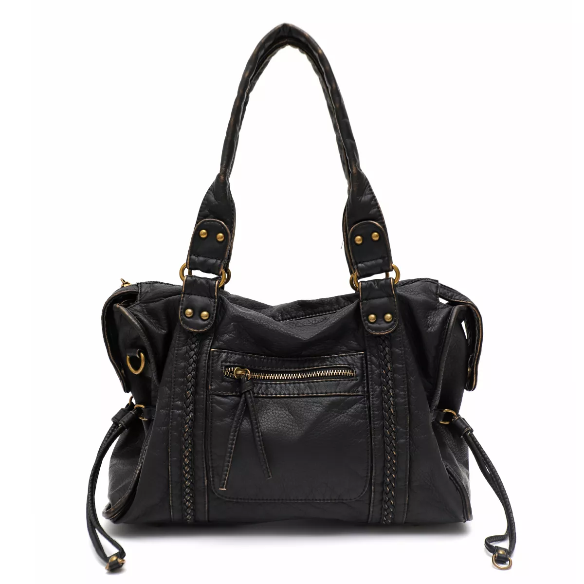 Large Capacity Washed PU Leather Tote with Braided Strap and Zip Pockets