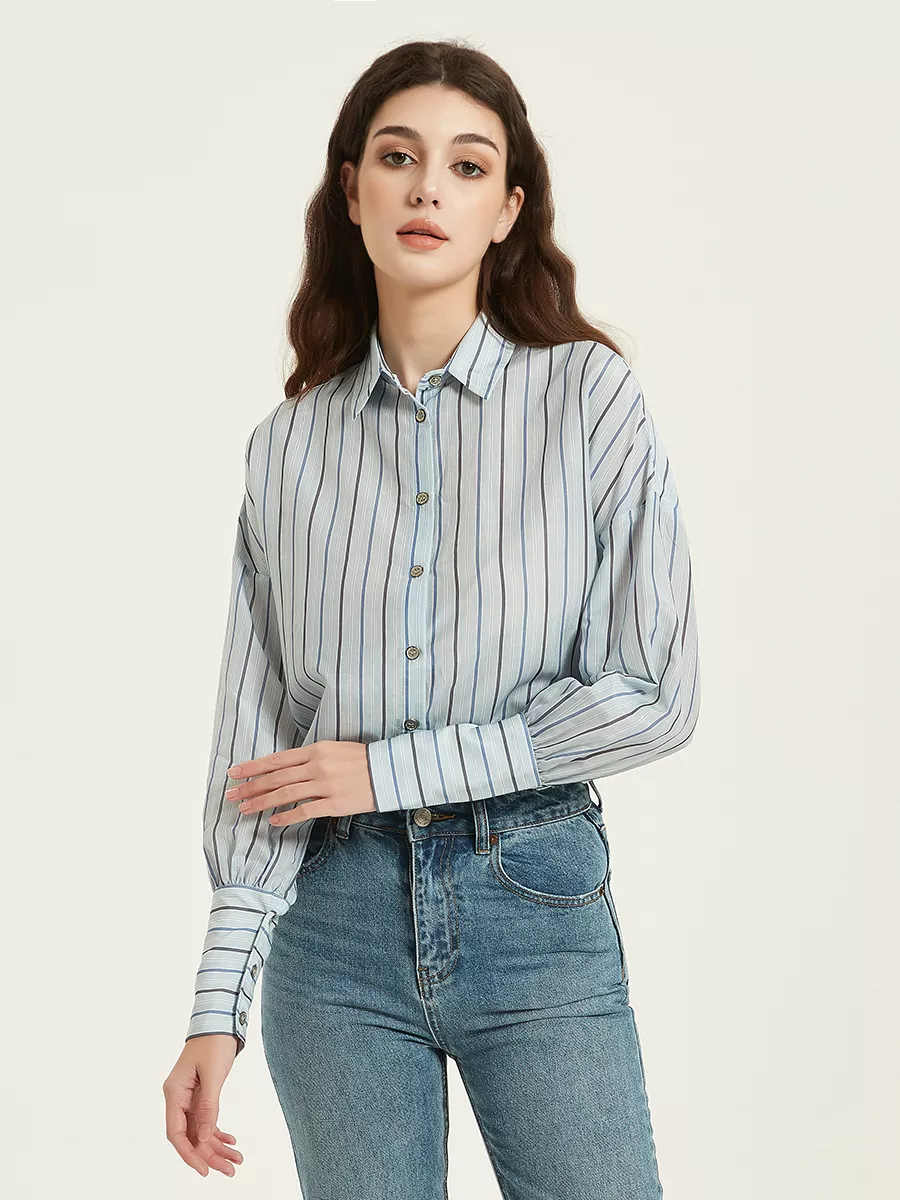 Step into a world of comfort and style with this Light Blue Striped Drop-Sleeve Blouse, crafted from a luxurious blend of 30% silk and 70% cotton. Designed to elevate your wardrobe, this blouse combines the breathable, natural feel of cotton with the smooth, elegant sheen of silk. With its timeless striped pattern and sophisticated yet relaxed fit, this blouse is ideal for women who appreciate both comfort and fashion.