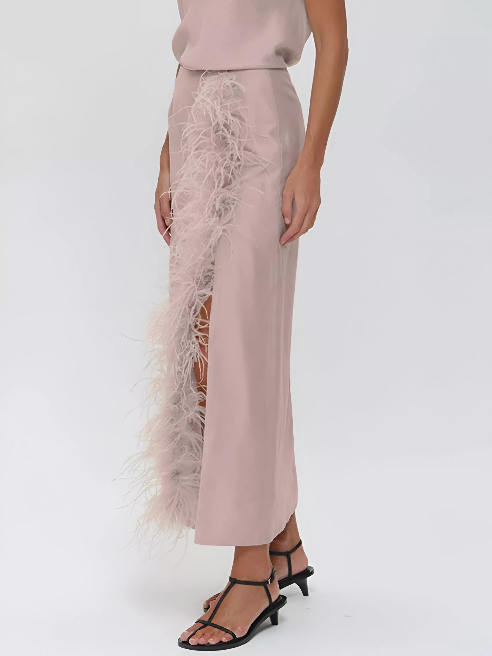 This skirt is designed to stand out. The feather slit not only adds an unexpected twist but also gives the skirt a dynamic edge that flows with every step you take. Whether you’re pairing it with a fitted top for an evening look or a casual blouse for a daytime outing, the loose, flowy design ensures comfort without sacrificing style. The satin finish is not just for show – it offers a subtle sheen that enhances your overall look while remaining soft against the skin.