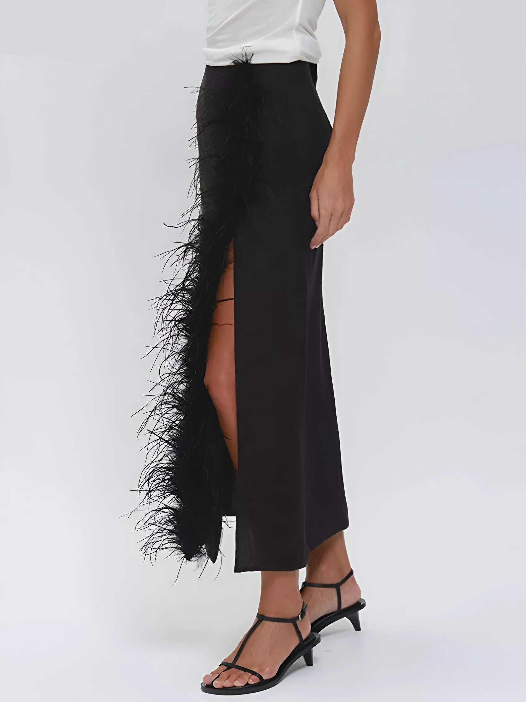 Crafted from high-quality polyester and spandex fabric, this skirt offers a soft, satin finish that catches the light beautifully, creating a stunning visual effect. The soft, luxurious material drapes perfectly around your figure, making it a versatile piece for any season. Its non-stretch elasticity ensures a flattering fit, while the feather detailing along the side slit adds a playful, yet sophisticated touch. Whether you’re attending a formal event or enjoying a casual night out, this skirt will make you the center of attention.