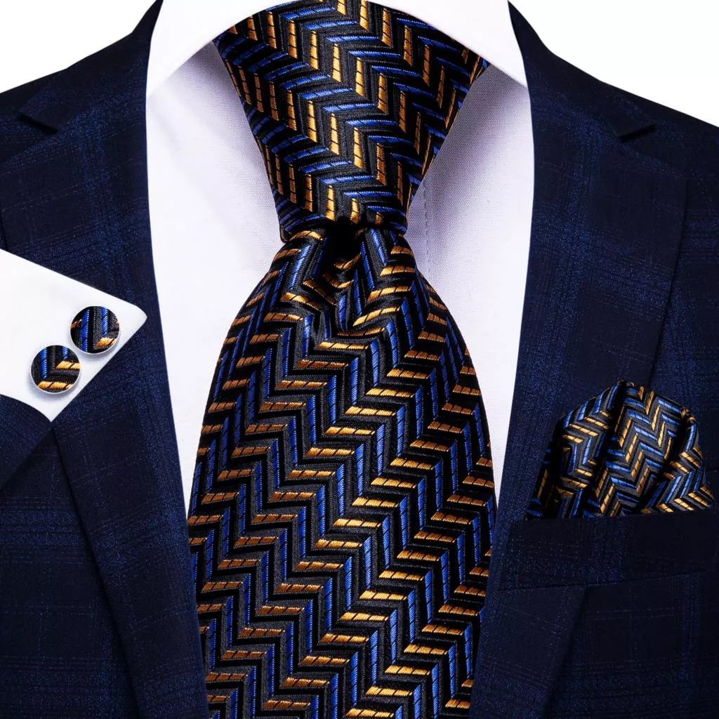 Make a lasting impression with this sophisticated Navy Blue and Gold Paisley Silk Tie Set. Designed for the modern gentleman, this tie set combines classic charm with contemporary flair. Whether you’re heading to a wedding, business meeting, or formal event, this luxurious set is the perfect accessory to elevate your outfit. Crafted from 100% jacquard-woven silk, it offers a premium feel and a polished finish that speaks of refinement and style.