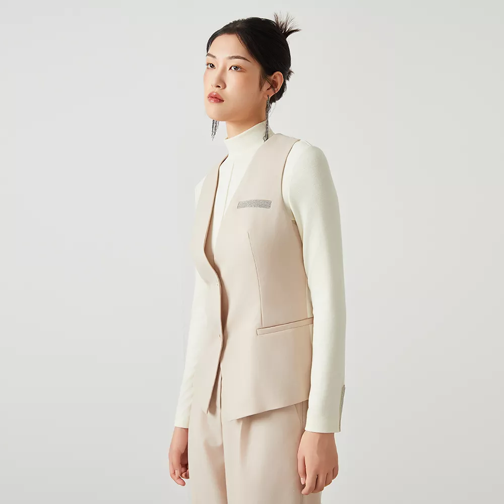 For a professional ensemble, layer this wool vest over a crisp white blouse and pair it with tailored trousers or a pencil skirt. For a more casual yet elegant look, wear it with a turtleneck sweater and slim-fit jeans. The solid color allows you to accessorize with scarves, statement necklaces, or a bold handbag for a personalized touch.