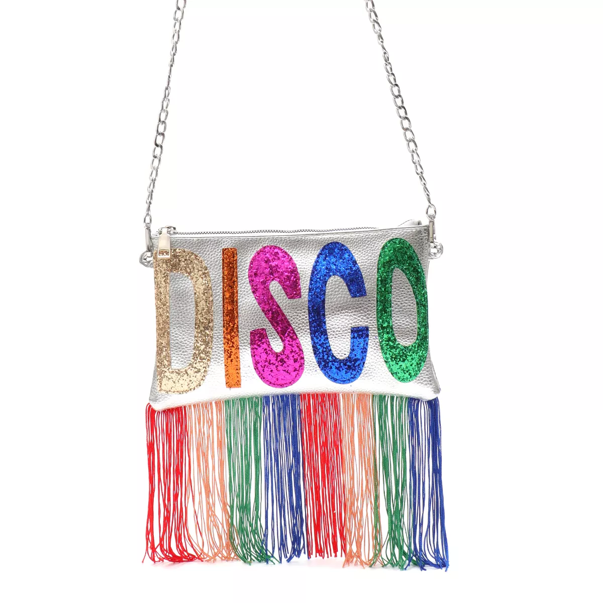 • Design: Colorful sequined letters and fringe tassels add a funky, playful vibe to the classic clutch style.