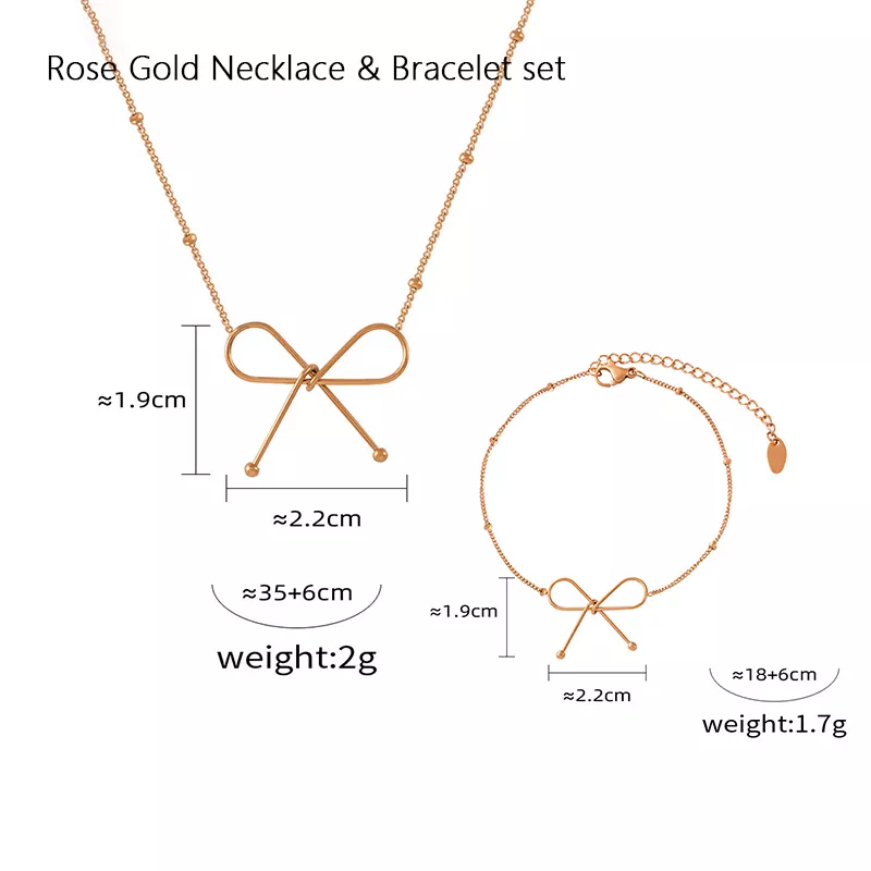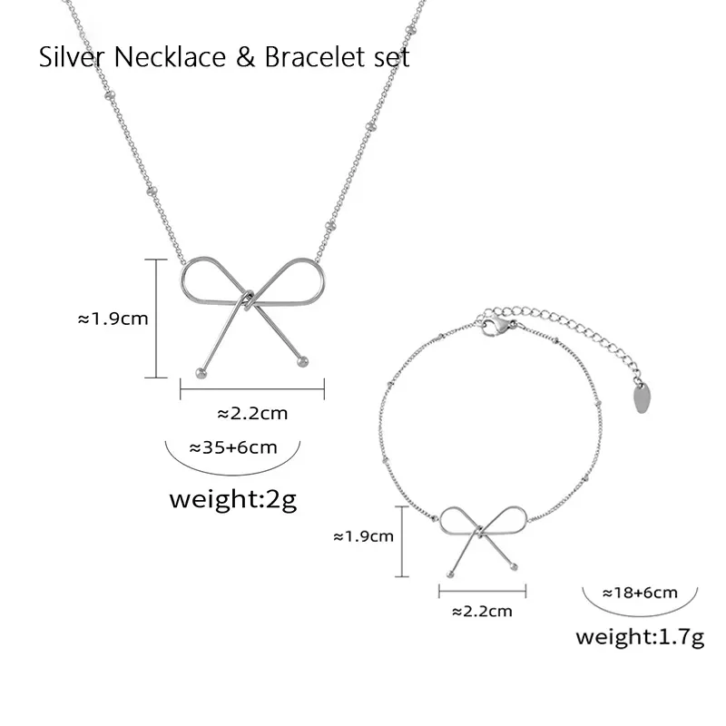 What sets this Bowknot Necklace and Bracelet Set apart is its impeccable combination of simplicity and charm. Crafted from premium stainless steel, it resists tarnishing, ensuring your jewelry retains its lustrous appearance for years to come. The delicate bowknot design adds a touch of romance, making it an excellent choice for date nights, weddings, or as a thoughtful gift for someone special.