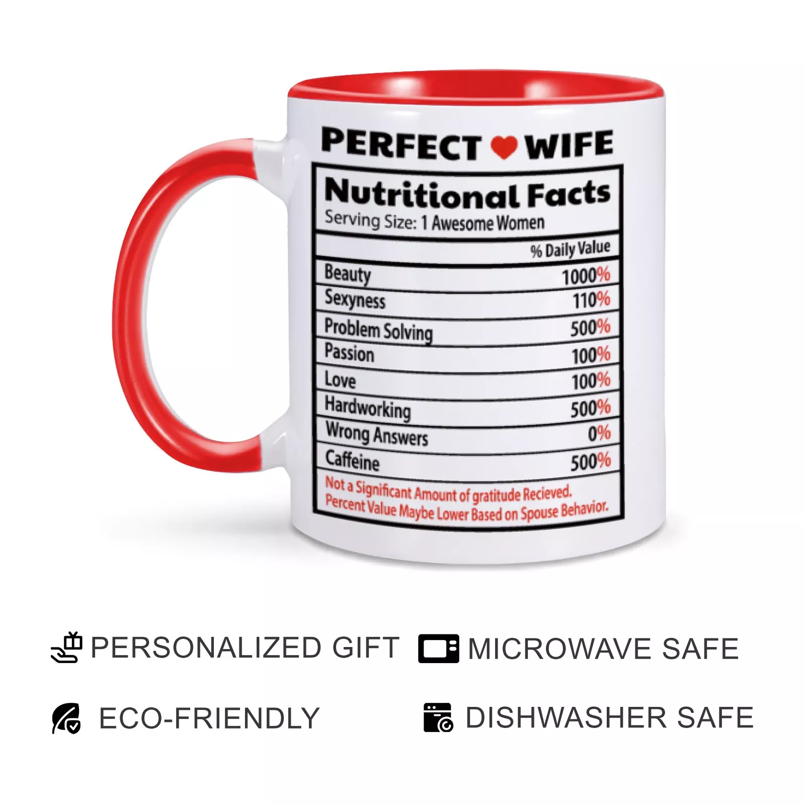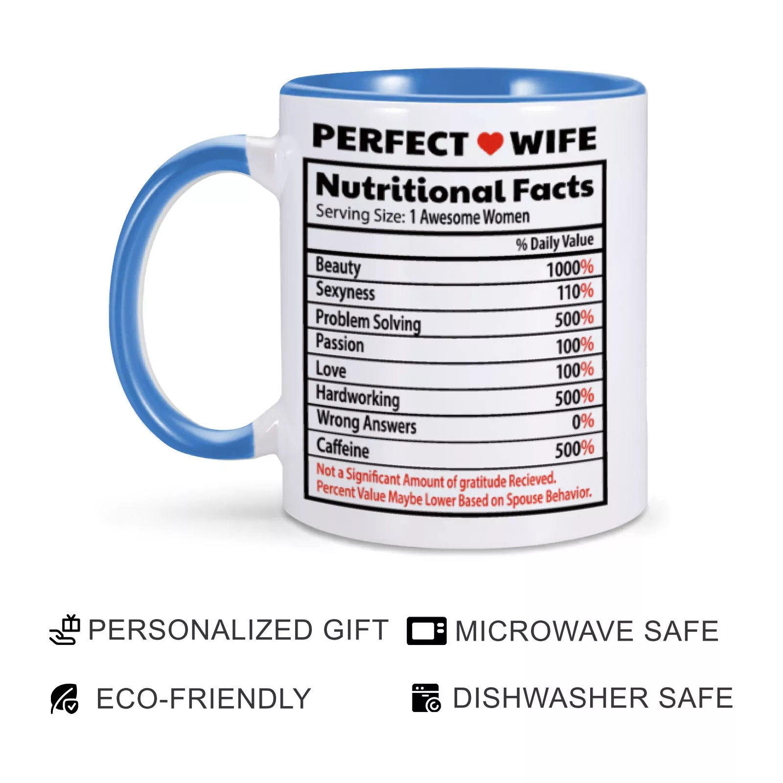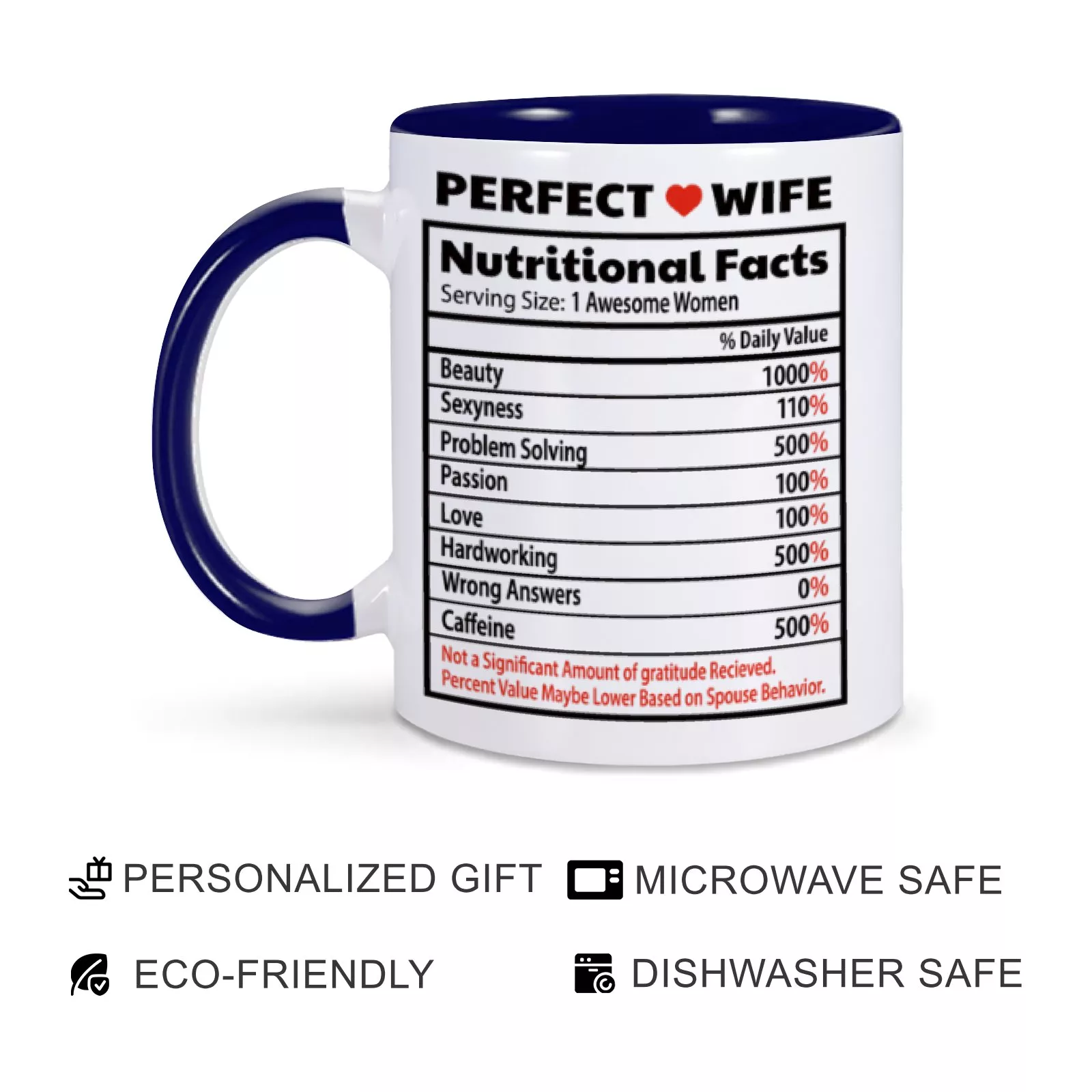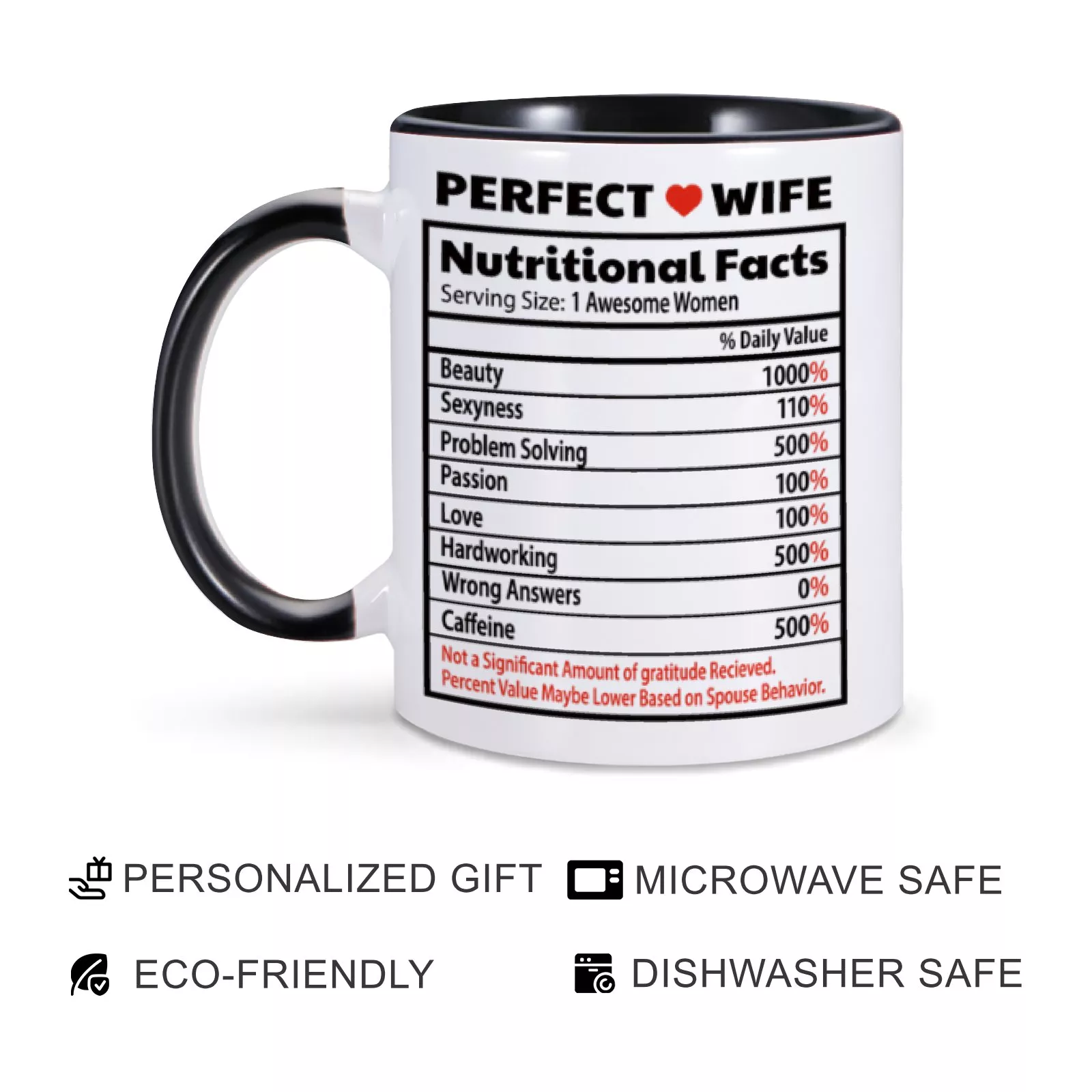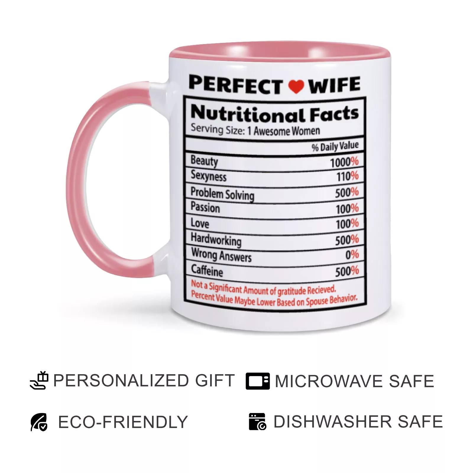 This mug isn’t just a drinkware item; it’s a heartfelt statement. Its playful “nutrition facts” design adds a unique touch, celebrating the qualities that make your wife extraordinary. Whether it’s her unwavering support, endless patience, or contagious laughter, this mug captures it all in a way that feels personal and meaningful.