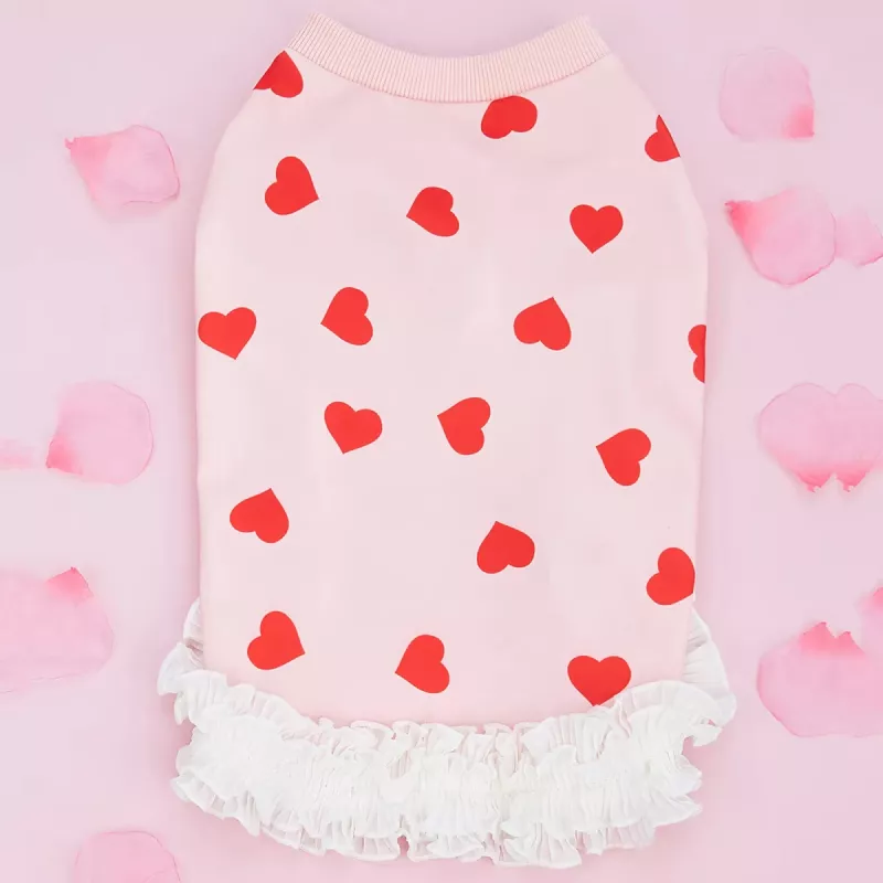 What sets this dress apart is its meticulous design and premium material. The charming hearts pattern is both playful and stylish, while the chiffon floral trim adds a sophisticated flair. Crafted from spandex, the dress offers superior comfort and flexibility, allowing your dog to move freely while looking stunning. It’s the perfect combination of beauty and practicality, ensuring your pet feels as good as they look.