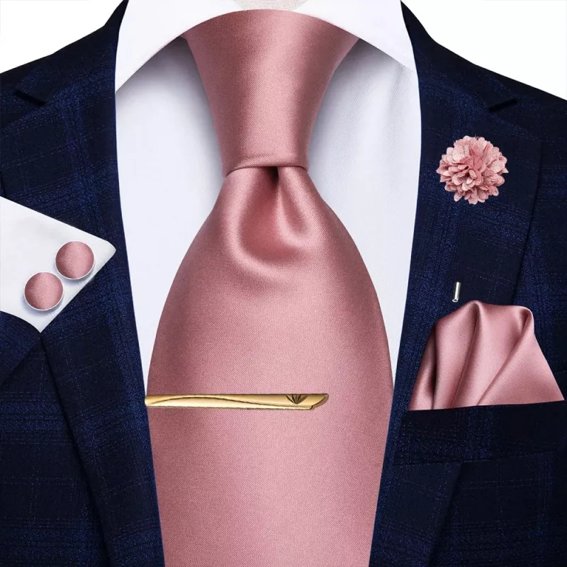 Elevate your style with this sophisticated Rose Gold Solid Silk Tie Set, designed to make a lasting impression at any special occasion. Crafted from 100% jacquard woven silk, this luxurious necktie offers a sleek and polished look, perfect for weddings, business meetings, or any event where you want to look your best. The set includes not only the stunning tie but also a coordinating pocket square, cufflinks, and a tie clip, making it a complete and thoughtful gift for the modern man.