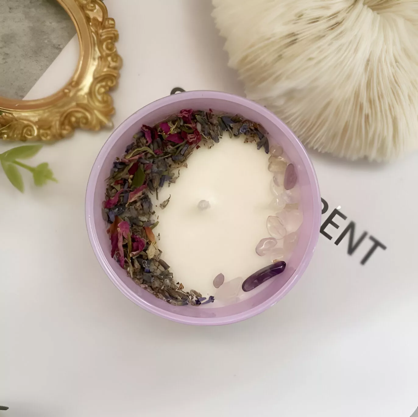 Carefully crafted with soy wax, this candle delivers a clean, even burn while filling your space with a soothing fragrance. The crystal stones and dried flowers embedded in the wax enhance its visual appeal, creating a centerpiece that’s both functional and elegant. Its compact size and cup-shaped design make it a versatile addition to any room, whether placed on a coffee table, vanity, or bedside stand.