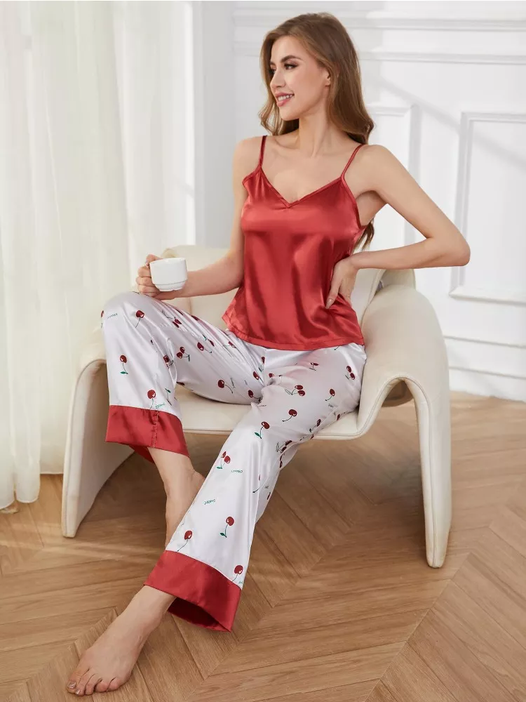 Transform your sleepwear collection with this stunning silk satin pajama set. Featuring a sleeveless, V-neck solid top and long cherry-print pants, this 2-piece set offers a perfect balance of elegance and comfort. Designed with high-quality fabrics, it ensures a soft, smooth, and delicate touch that feels amazing against your skin. Whether you’re relaxing at home or enjoying a girls’ night, this set is your go-to for effortless style and relaxation.