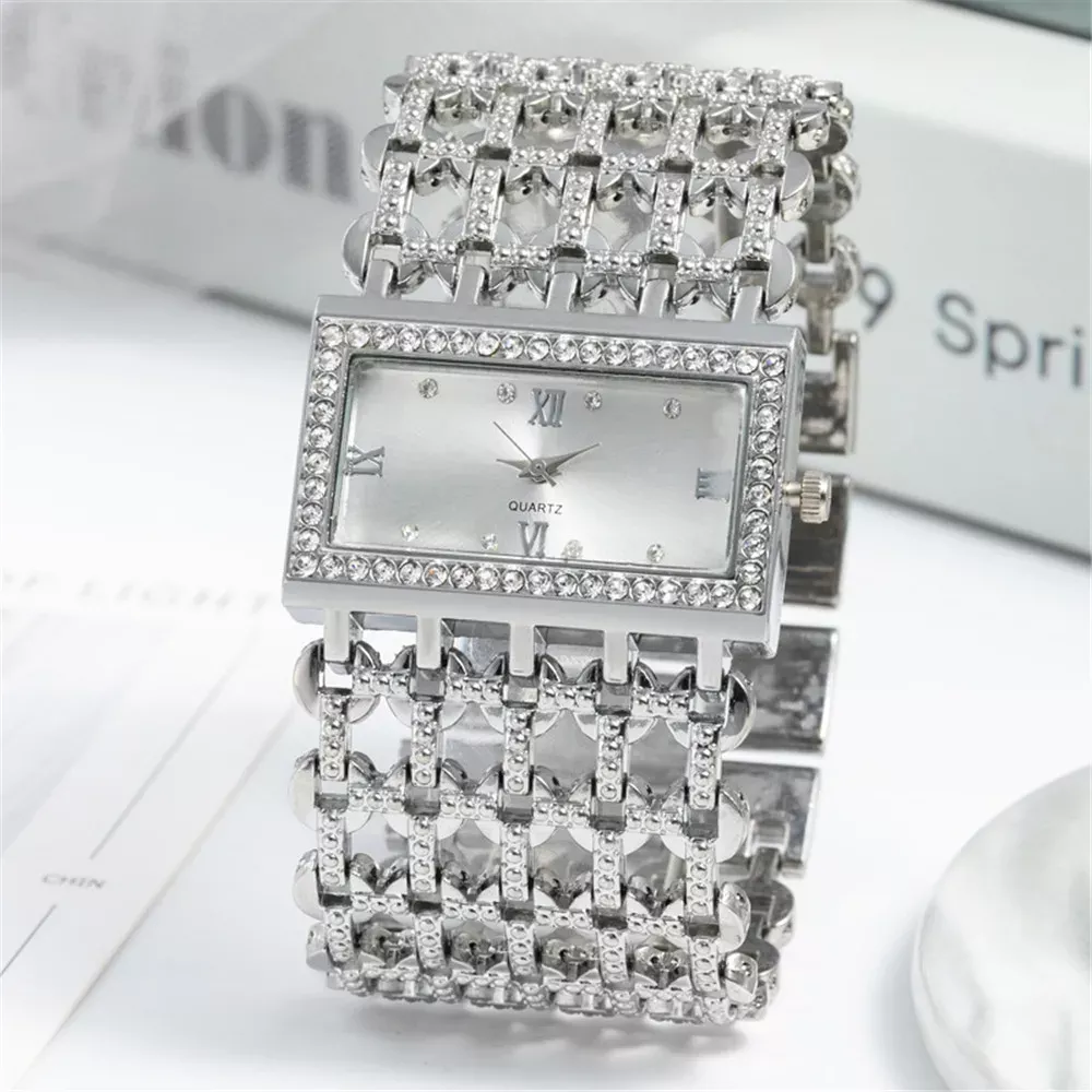 Luxury Women’s Quartz Watch with Shining Dial and Diamond Square Alloy Bracelet
