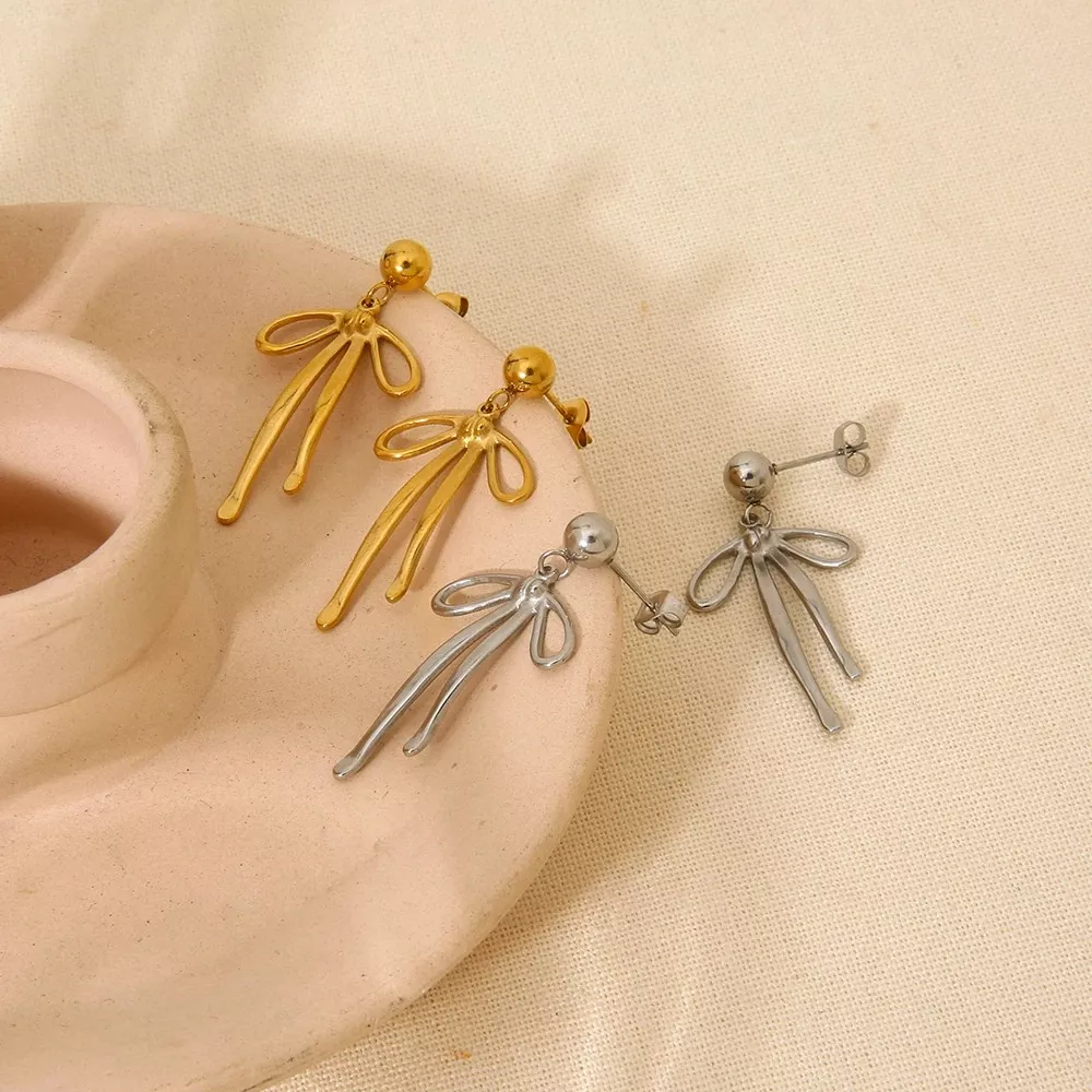 18K Gold Plated Stainless Steel Ribbon Bowknot Drop Earrings for Women
