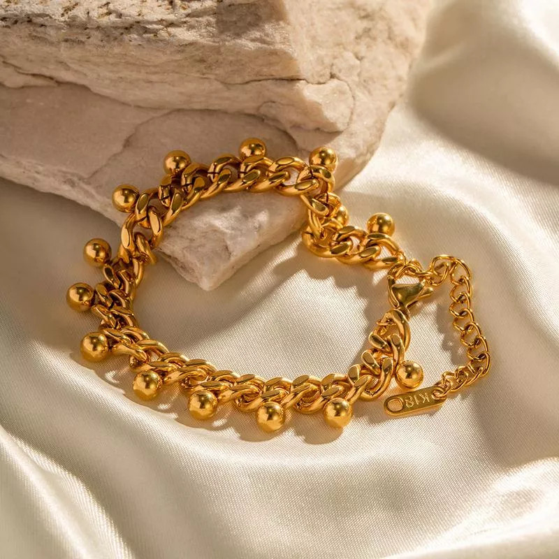 18K Gold Plated Stainless Steel Cuban Chain Bead Tassel Bracelet