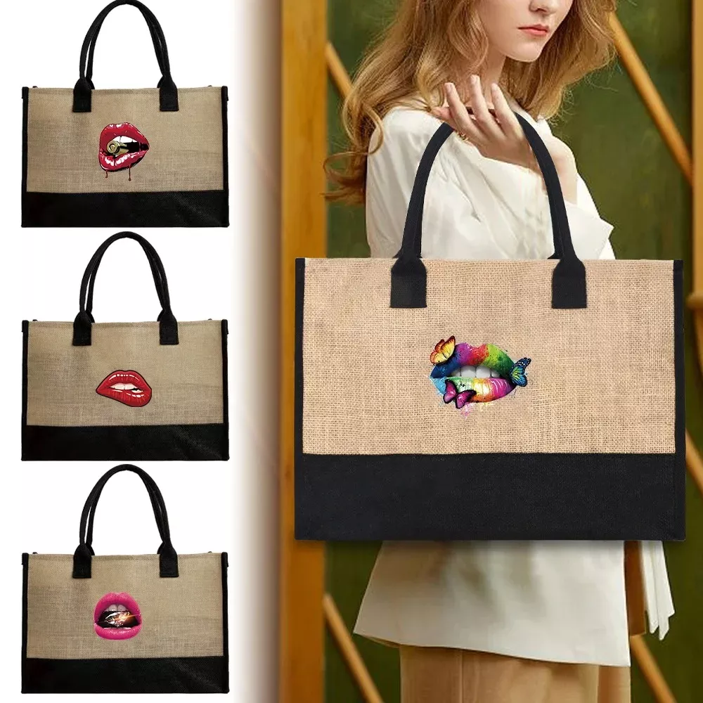 Waterproof Jute Tote Bag for Women, Large Canvas Shoulder Bag with Color Print