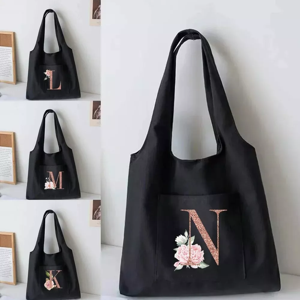 Women’s Canvas Tote Bag with Rose Gold Letter Design and Side Pocket