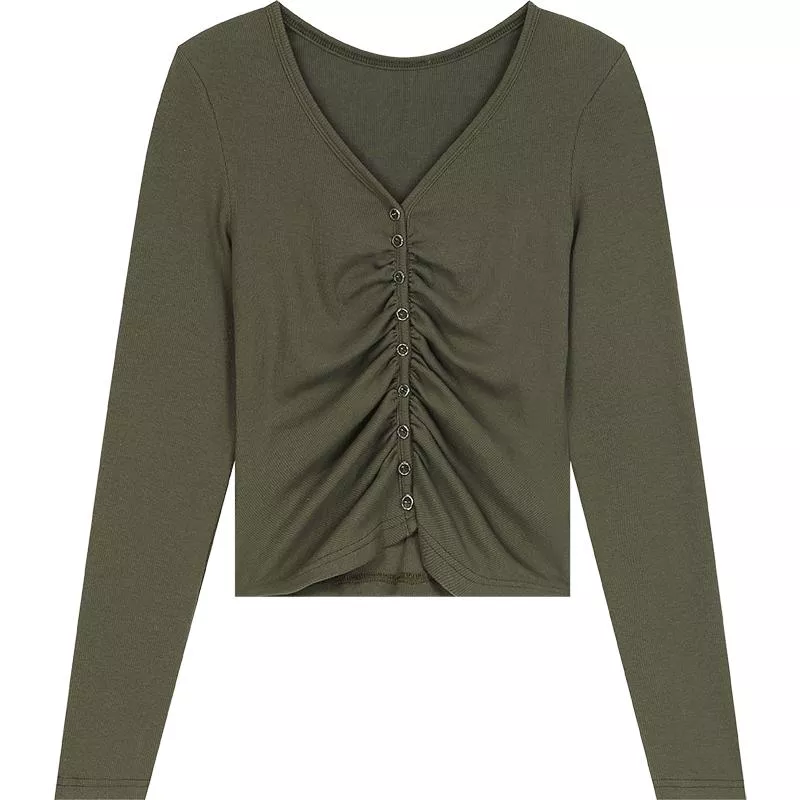 With its elegant pleats and button detailing, this casual yet sophisticated top brings a touch of Korean-inspired style to your winter looks. The timeless army green color complements a variety of outfits, from casual jeans to more polished skirts or trousers. Whether you’re headed to brunch, a weekend outing, or a cozy evening gathering, this versatile tee is a must-have addition to your seasonal wardrobe.