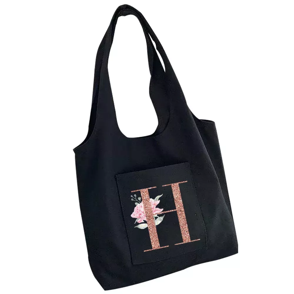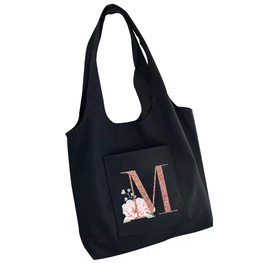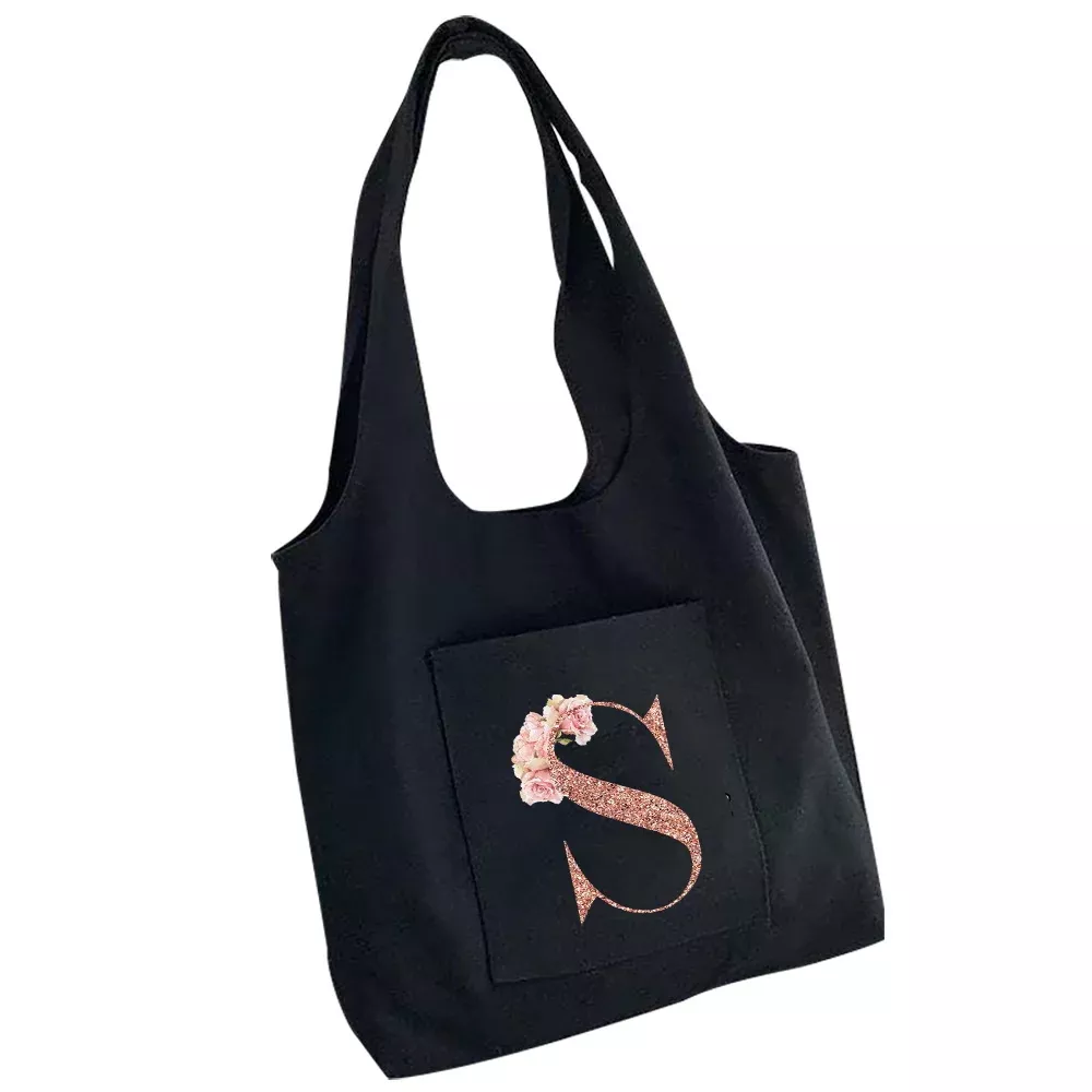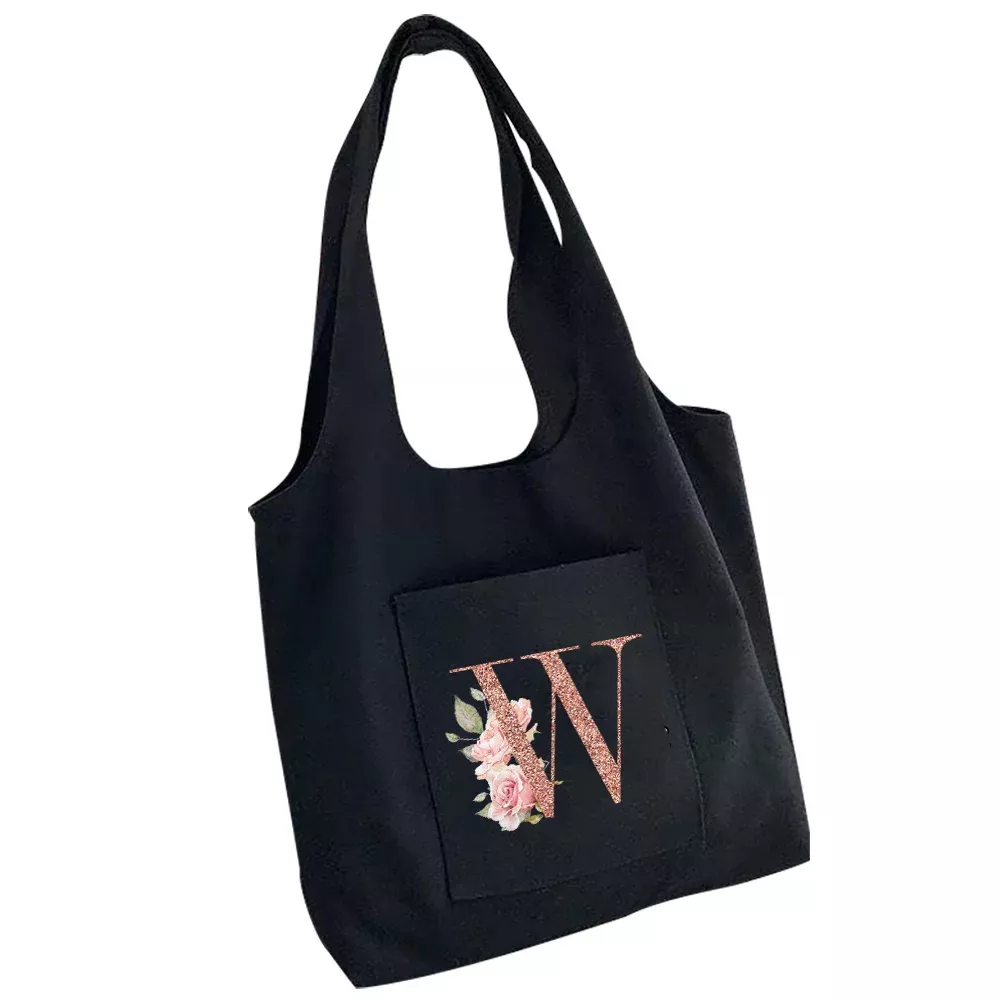 Women’s Canvas Tote Bag with Rose Gold Letter Design and Side Pocket