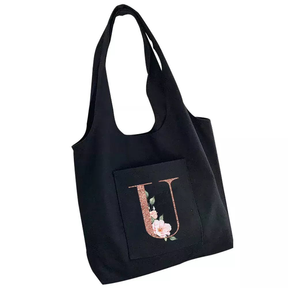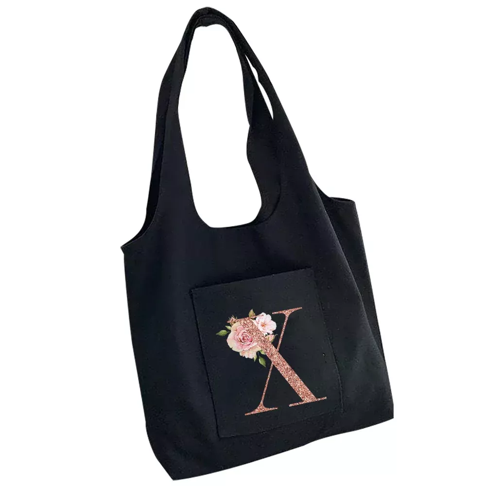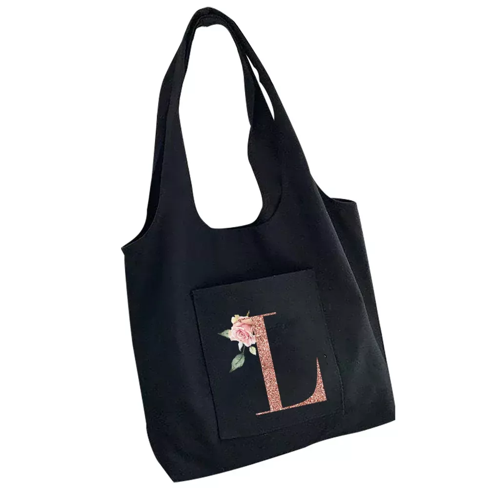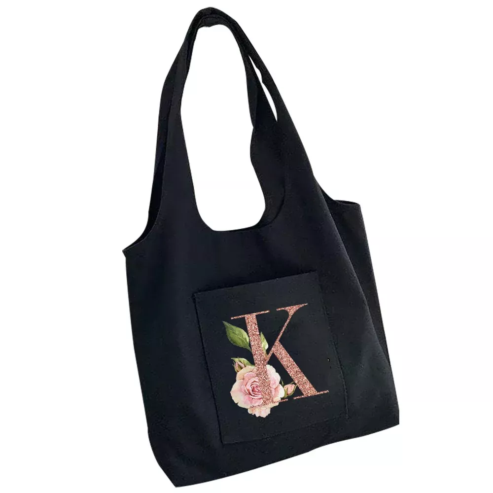 Women’s Canvas Tote Bag with Rose Gold Letter Design and Side Pocket