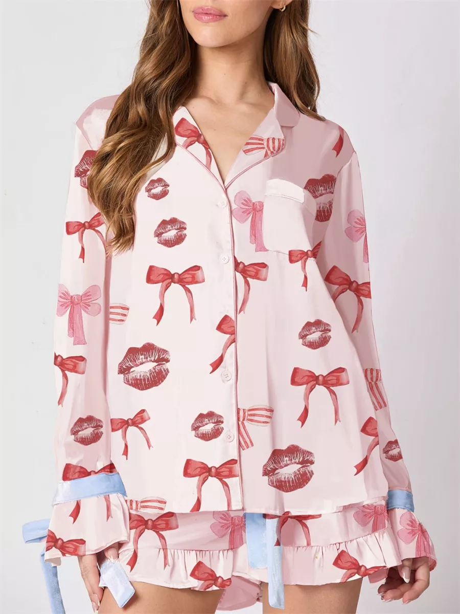 Elevate your loungewear with this adorable Women’s 2-Piece Satin Silk Pajama Set, featuring a playful bow and lips print that exudes charm. Designed for comfort and style, this Y2K-inspired set includes a button-down shirt with a turn-down collar and ruffle shorts, making it perfect for lounging, sleeping, or celebrating cozy evenings. The soft satin silk material offers a luxurious feel, while the lightweight design ensures you stay cool and comfortable all night long.