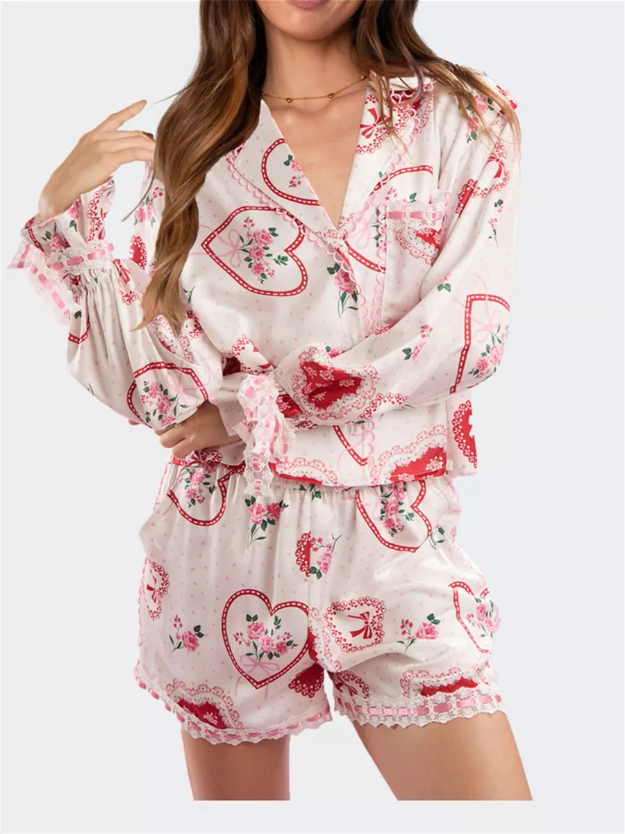 Get cozy and stylish with our Women’s Cute Valentine’s Day Pajama Set, a perfect blend of charm and comfort. This two-piece loungewear features a delightful floral and heart print, making it an ideal choice for Valentine’s Day or any time you want to feel sweet and feminine. With its turn-down collar, full sleeves, and lace-trimmed shorts, this set combines elegance with playful details for a look you’ll adore.