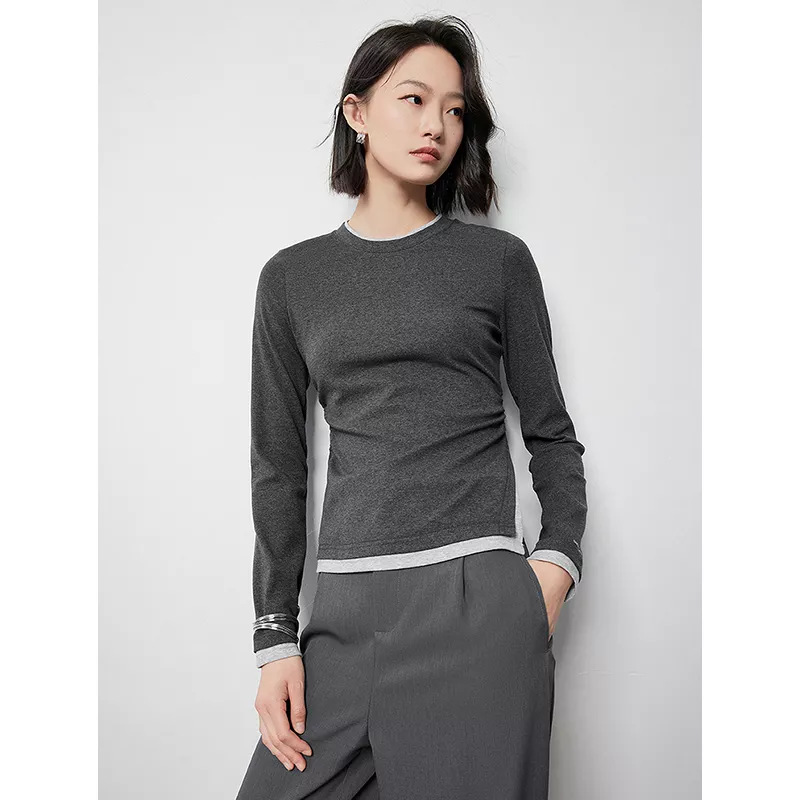 This long-sleeve top stands out with its innovative design that mimics the layered effect of a two-piece outfit. The shirred detailing at the waist creates a slimming effect, while the open slit adds a modern and trendy touch. Its contrasting color design makes it an eye-catching addition to any wardrobe. Whether you’re heading to the office or meeting friends, this versatile piece can be dressed up or down effortlessly.